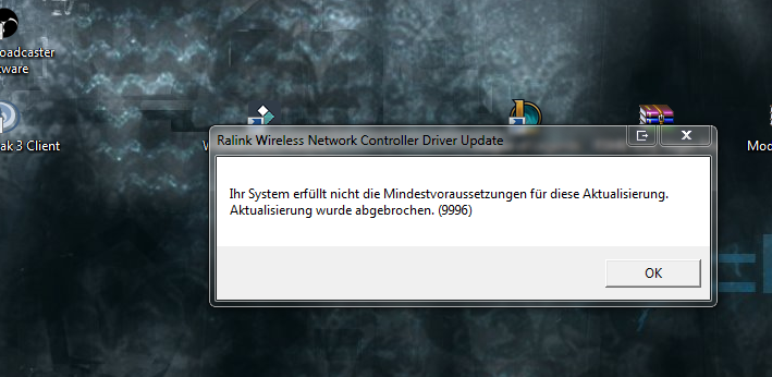 Normalerweise nutze ich mein Internet mit einer Kabelverbindung. Jedoch kann ich deshalb nie meine Türe schliessen, was etwas nervig ist. Ich weiss, dass ich eine Wlan Karte eingebaut habe, da ich vor ca. einem Jahr mich mal mit dem Wlan verbunden habe. Jedoch habe ich im Januar meinen PC neu aufgesetzt und jetzt, wo ich mich mit dem Wlan verbinden will, geht es natürlich nicht. Den Treiber habe ich aus dem Internet heruntergeladen und installiert. Sobald ich aber das Treiberupdate von der Seite oben machen will, steht dass ich nicht genug systemressourcen habe. "Ihr System erfüllt nicht die Mindestvoraussetzungen für diese Aktualisierung. Aktualisierung wurde abgebrochen. (9996)