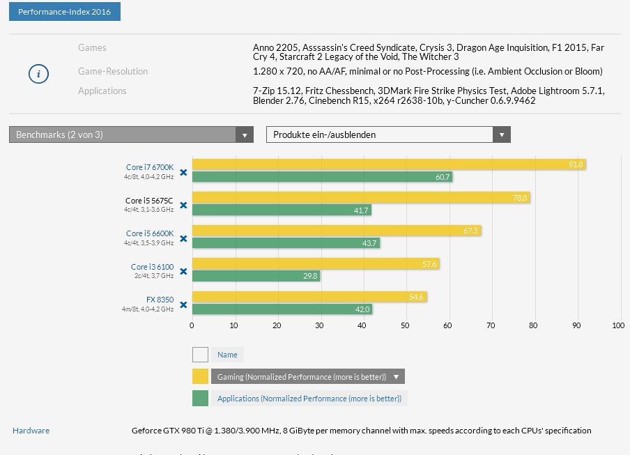 in dem von dir verlinkten vergleich schneidet der von mir vorgeschlagene i5 5675c zwar aufgrund von einer spieleauswahl, die sehr wenig von hat profitiert und einem stellenweise eintretenden gpu limit sehr gut ab, da ich aber davon ausgehe, das die spiele weiterhin auf eine zunehmende anzahl von threads optimiert werden, habe ich mich auf einen test bezogen, in dem hauptsächlich spiele getestet wurden, die die cpu sehr gut auslasten.