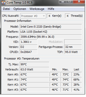 Der i5-2320 wird ab Temperaturen von 72.6°C auf jeden Fall runtertakten und erst wieder hochtakten, wenn die Temperatur wieder runter ist. Genau das führt du den Rucklern.
