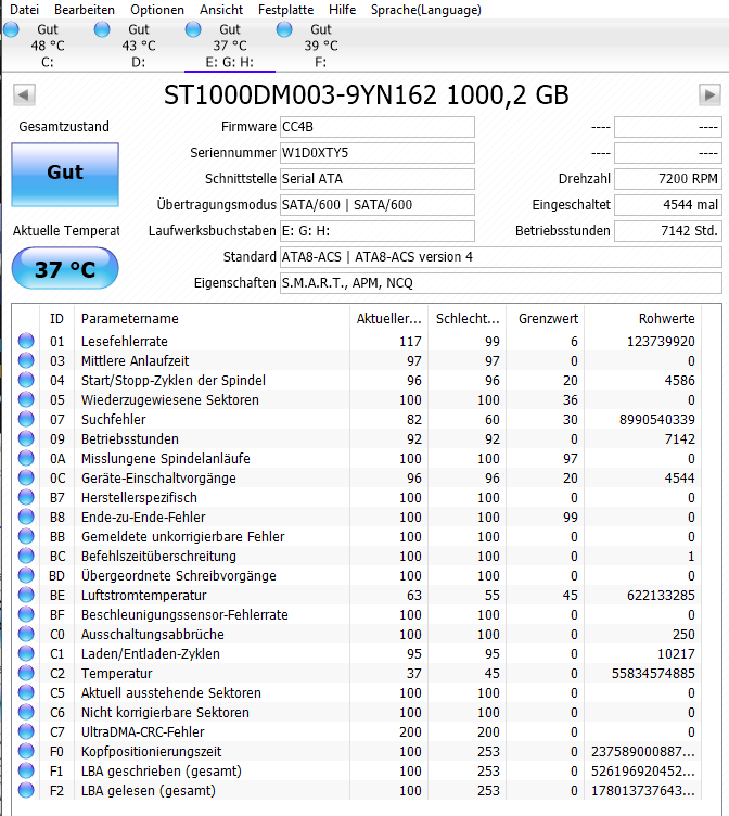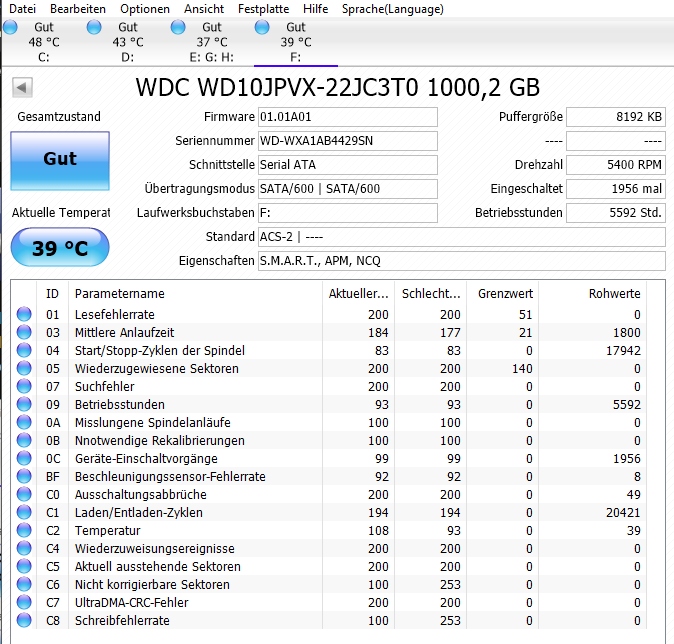 Die WD hatte schon mal 54° das ist etwas zu hoch - aber sonst sind die SMART Werte OK!