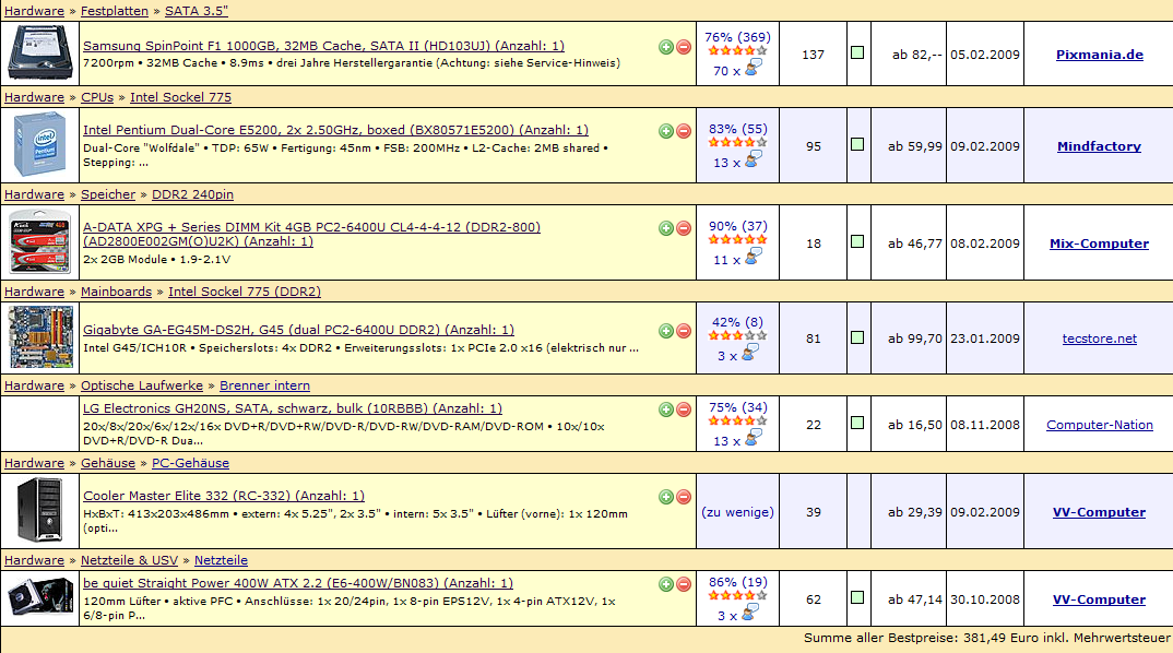 Hi ich wollte mir ein neuen pc zusammenstellen er wird nur für icq, filme, office und musik benötigt also nicht zum spielen ich möchte aber keine onboard grafikkarte Der monitor wird ein 22" bzw 23" und kosted ca 180euro hätte also noch 420euro für den pc