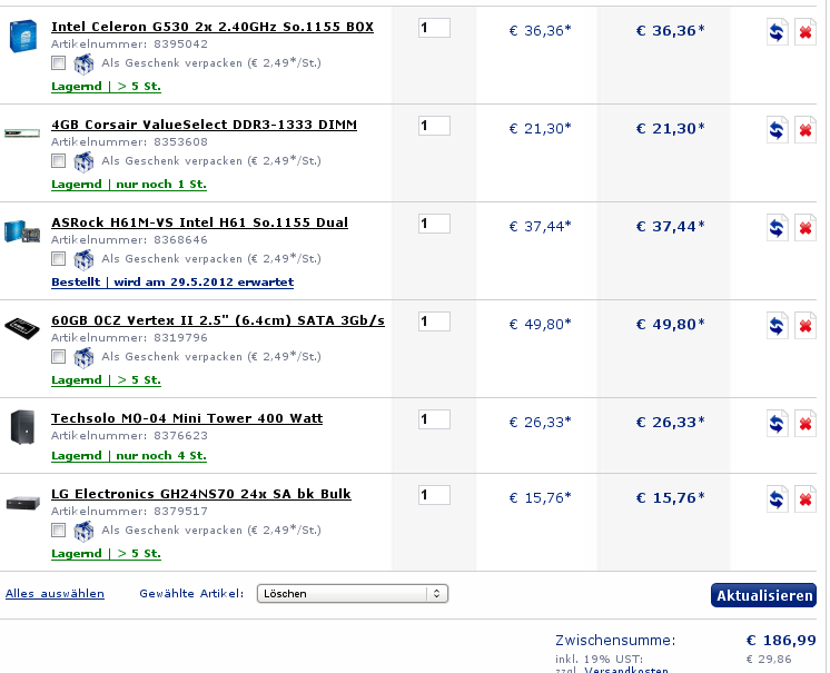 Bei der Nachschau nach den Komponenten fiel mir auf, dass man die Preise wohl nicht richtig recherchiert hat. Die Preise für Prozessor und Mainboard sind imho zu hoch angegeben. Wenn man die Sachen günstig einkauft, dann sollte man für das genannte Geld sogar einen Celeron Dual-Core G530 bekommen können. Evtl. ist sogar dann noch ein DVD-Brenner drin im Budget?