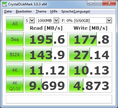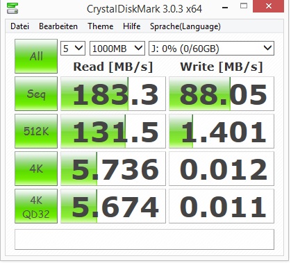 Hier mal die Werte von Crystal Disk Mark meines Sandisk Cruzer Extreme 64 GB an dem PC aus der Signatur unter Windows 7. Für um die 60€ ist das Ding eine Rakete: