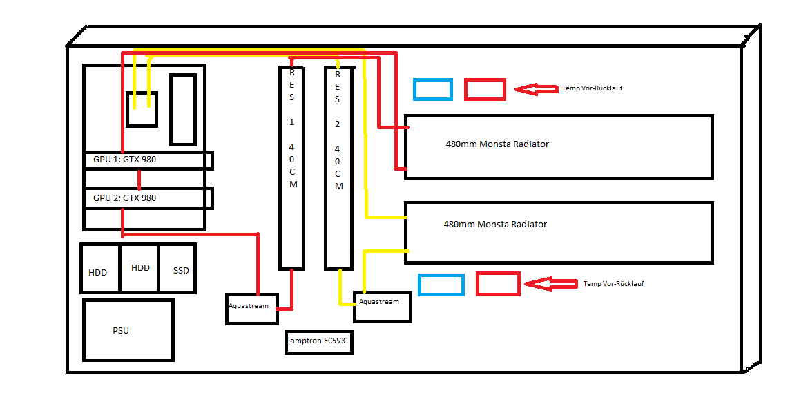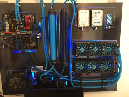 Insgesamt ist die Vorlage eher eine wie man es nicht machen sollte, es schaut einfach unordentlich aus. Grundsätzlich gibt es abseits der EMV keine Probleme mit einer Wandmontage aber wenn man sich schon so viel Arbeit macht und gut 1000€ in wakü Komponenten versenkt würde ich das gleich vernünftig konzipieren.