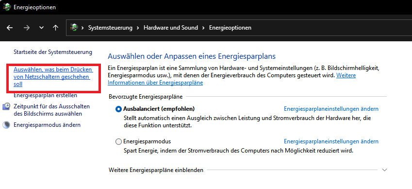 Dort dann "auswählen, was beim drücken von Netzschaltern geschehen soll" anklicken (bei dir dann irgendwas in english ).