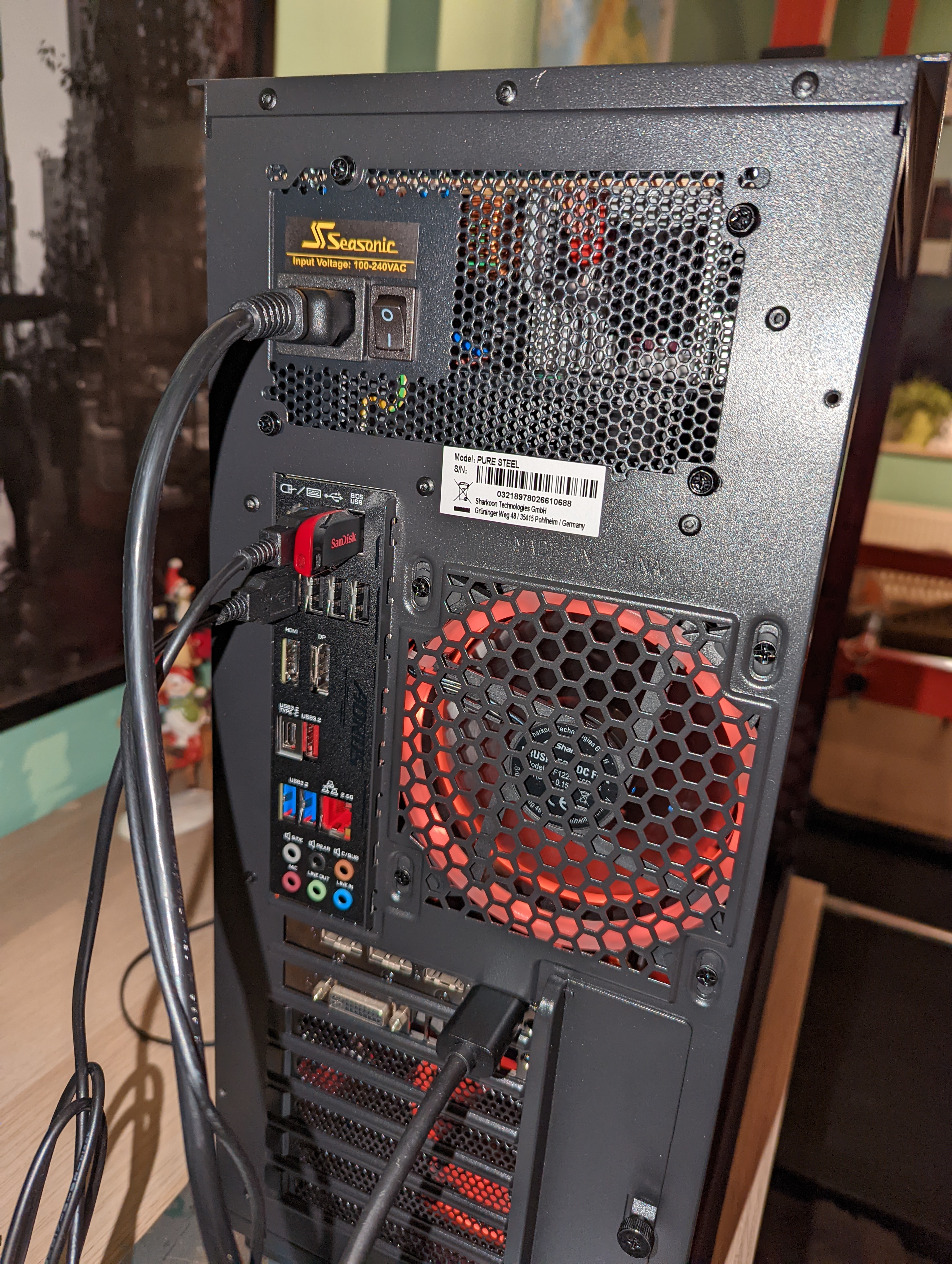 Bei den Anschlüssen sind aktuell nur Maus, Tastatur, Monitor und USB-Stick mit Win10 angesteckt (und Netzteil)