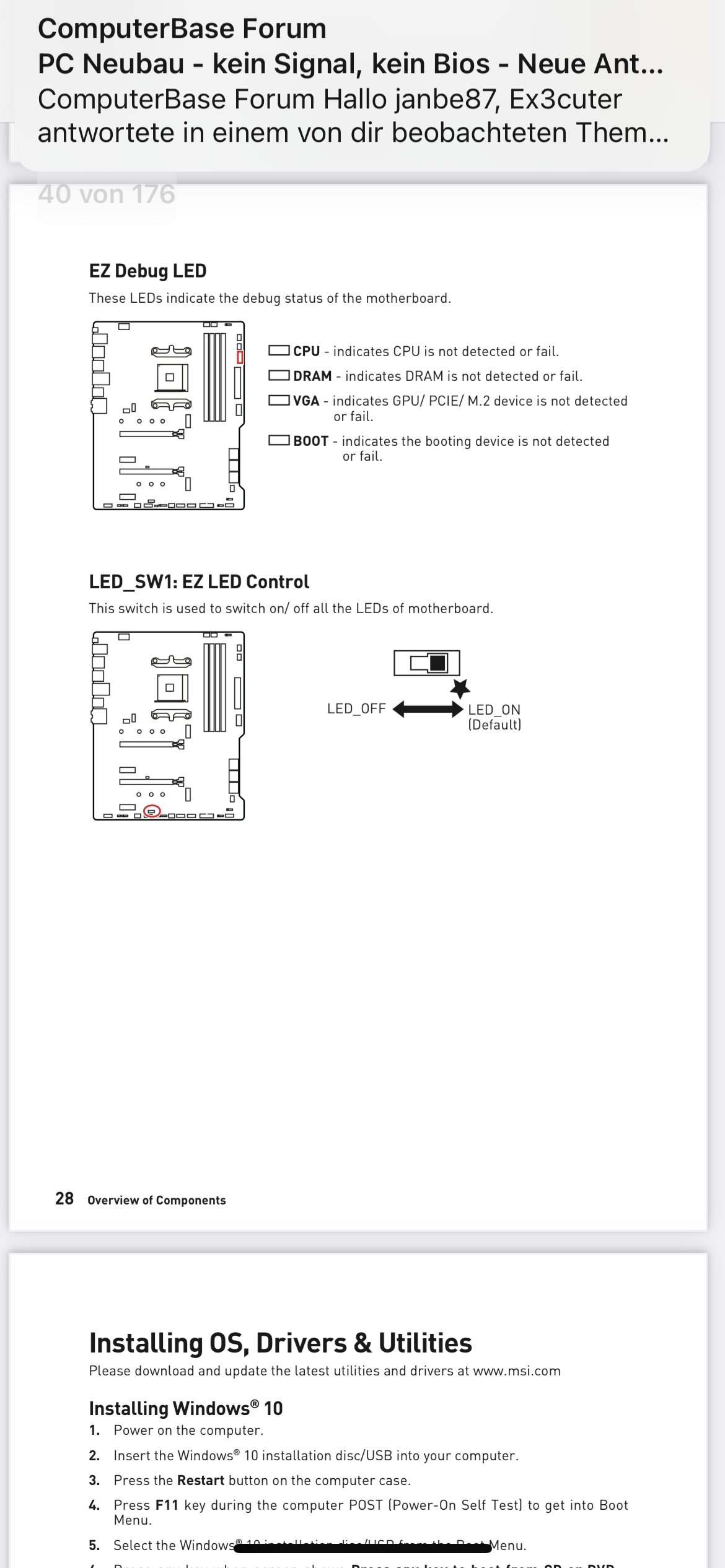 alles wieder zusammen. PC an, EZ Debug Leuchte be Weile bei der CPU an (10sek?), dann aber aus, Ram überspringt es, bei VGA auch so 5-10 sek an, bei Boot bleibt es weiß..
