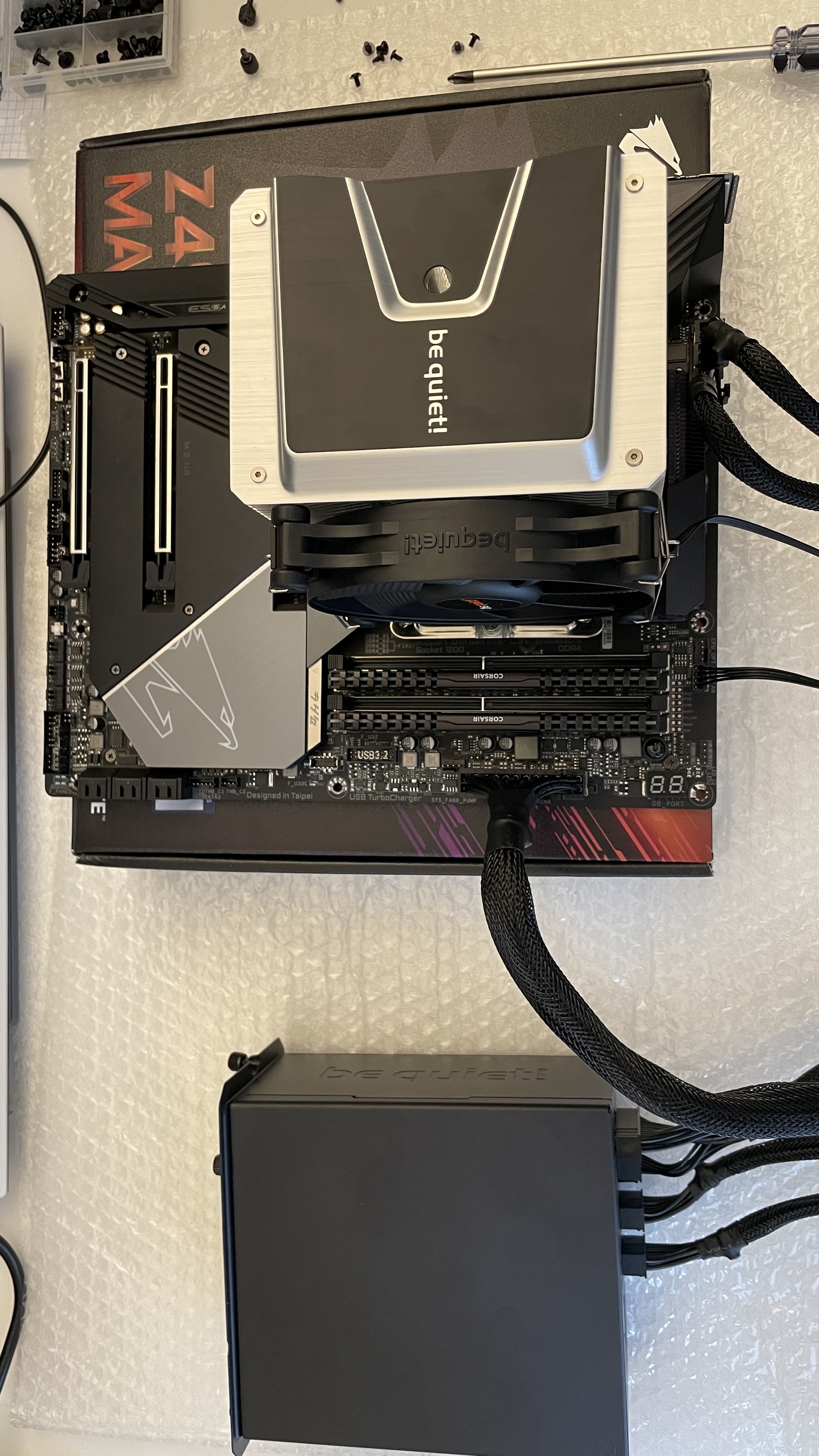 Hi. Ich habe eben das Mainboard mit CPU und Kühler ausserhalb des Gehäuses angeschlossen. Das Netzteil schaltet sich immer noch immer wieder aus und an. Bilder sind anbei.