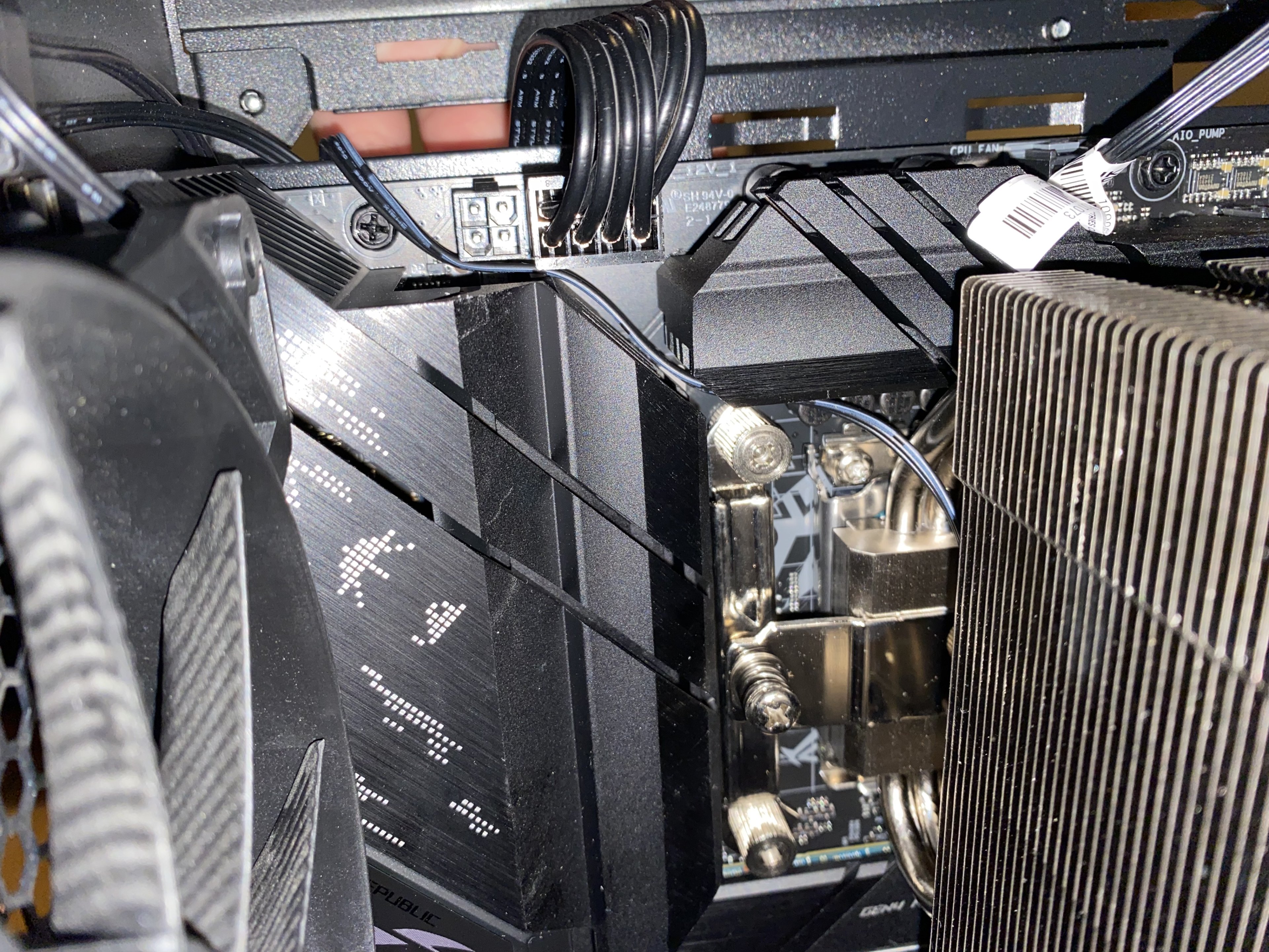 Sobald ich ihn an mache leuchtet der RAM und der Lüfter, sowie das Mainboard. Allerdings kriege ich kein Bild und auch keiner der Lüfter läuft. Der hintere Lüfter ist separat gesteckt, die beiden vorne über einen Y-Stecker. Das BIOS Updste wurde über Flashback gemacht. Dafür habe ich die Datei auf den Stick gepackt, umbenannt, den Flashback Knopf drei Sekunden gedrückt und den Stick entfernt nachdem das Licht ausging. Dabei war noch nichts auf dem Mainboard angebracht. Schließlich habe ich alles zusammengebaut: