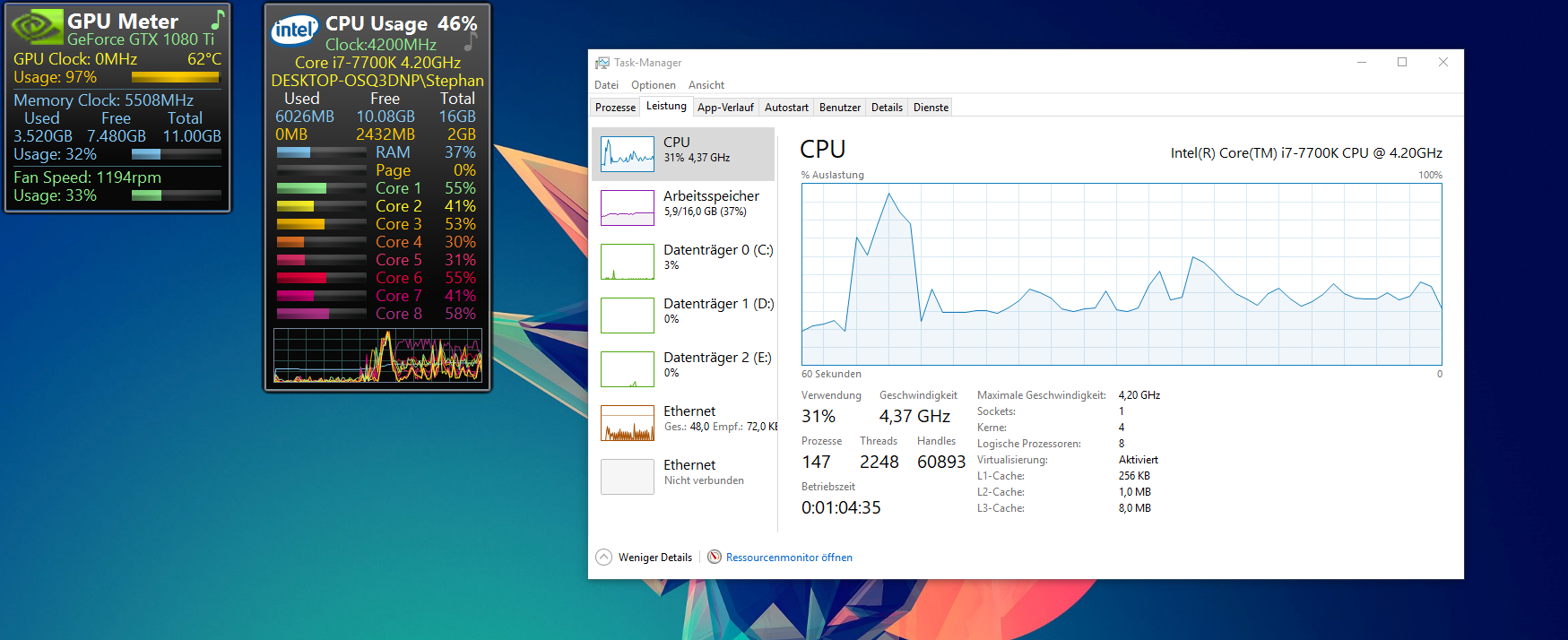 - i7-7700K Cpu @4,20GHz (8CPUS), ~4,2GHz