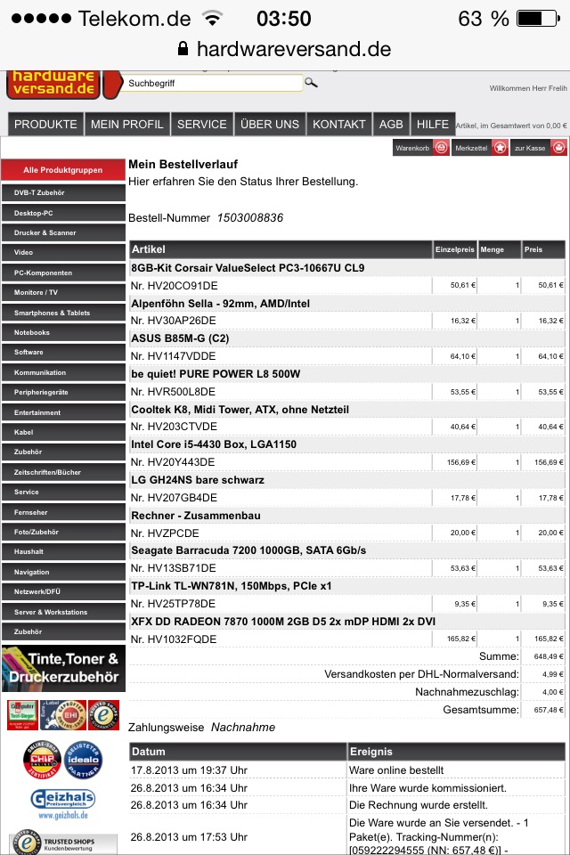 Habe mir einen PC bei Hardwareversand zusammen bauen, dieser lief auch circa 1 Jahr astrein bis mir auffiel das sie die USB 2.0 Ports in der Front nicht richtig festgemacht haben und diese nach unten ins Gehäuse rutschten als ich meine Webcam reinstecken wollte. Doof wie ich bin hab ich das Gehäuse natürlich nicht aufgemacht und die USB Ports richtig festgemacht, nein ich habe versucht diese wieder mit ner Schere nach oben zu ziehen *facepalm*