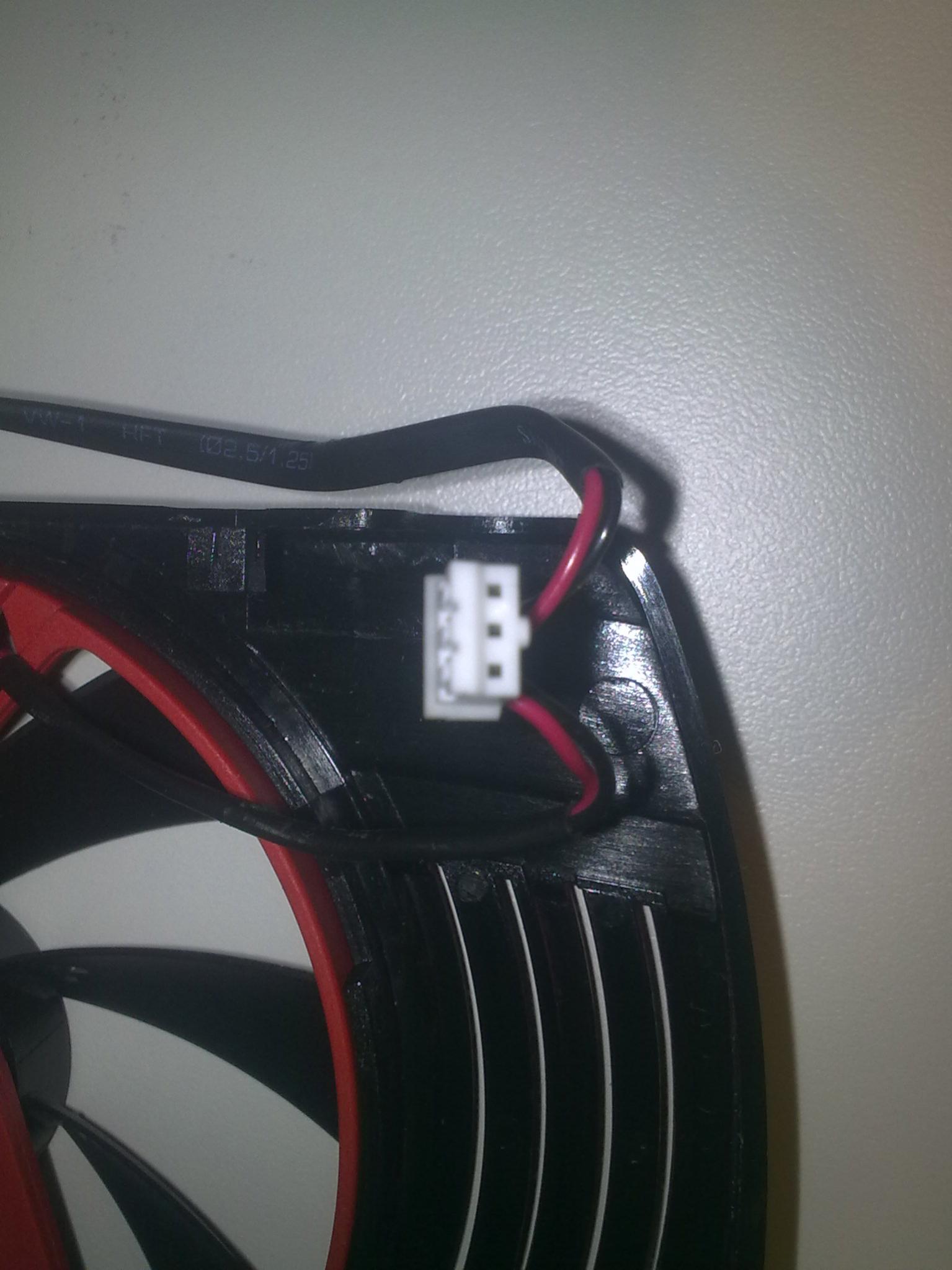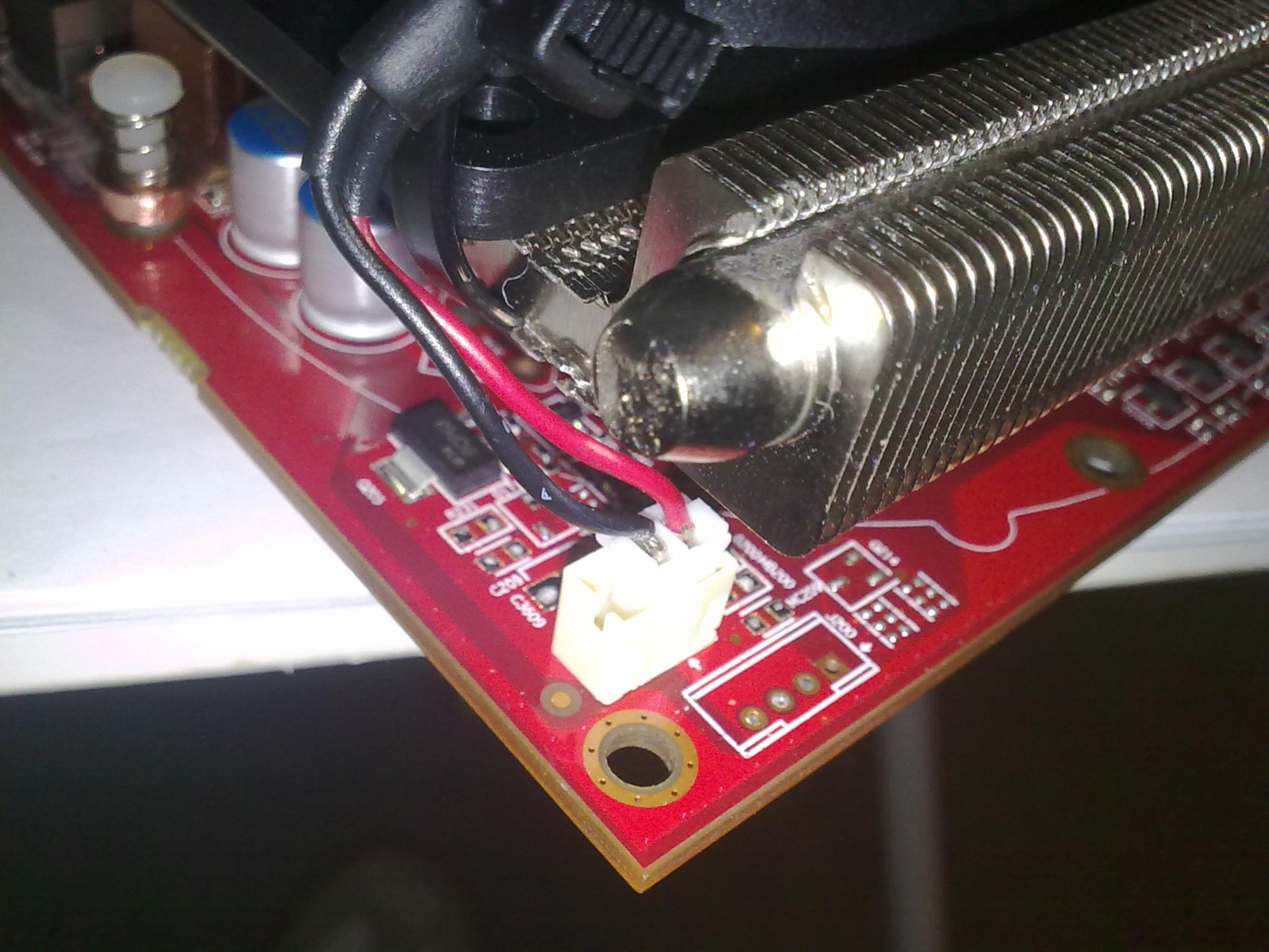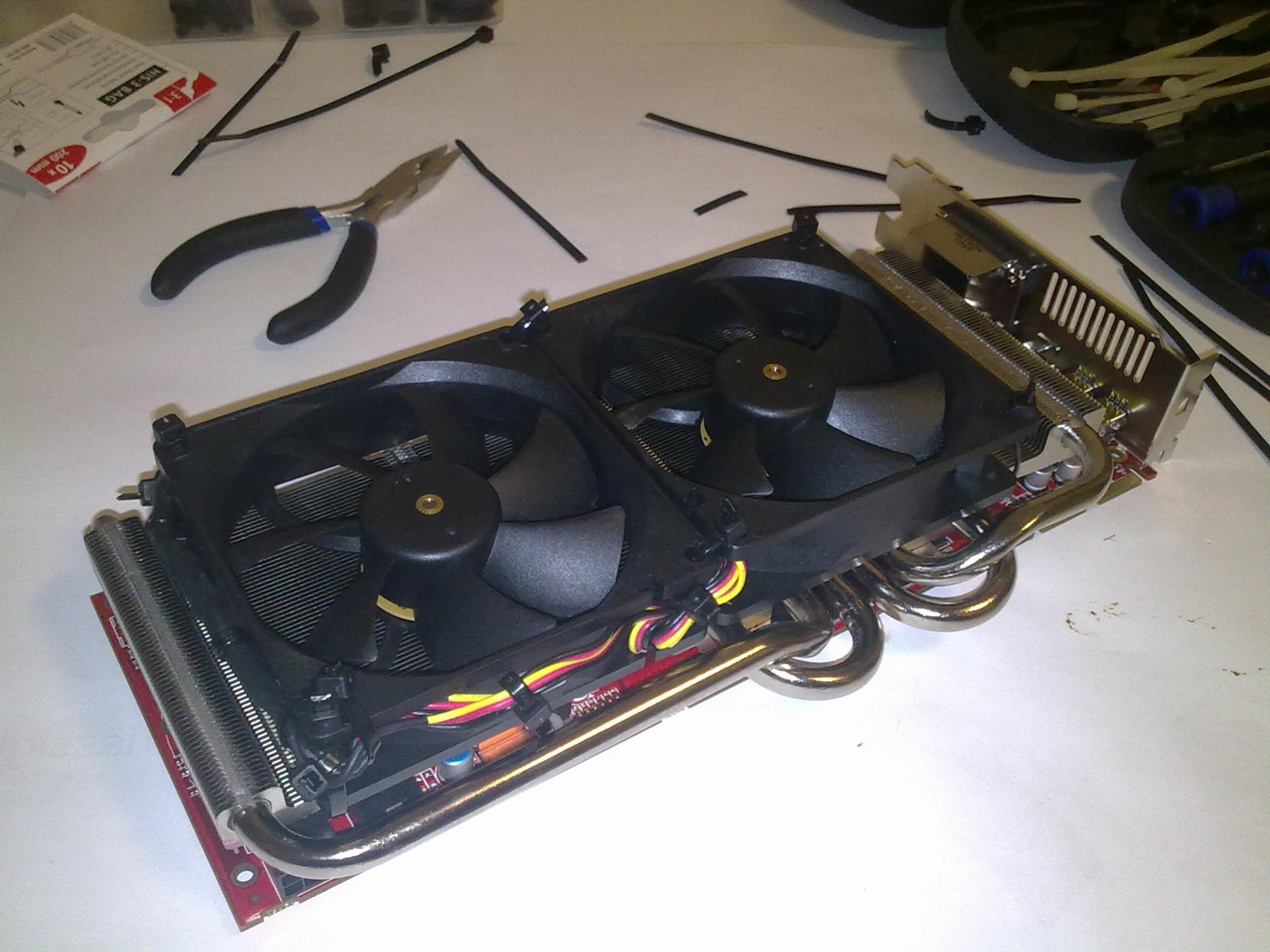 Momentan sind die beiden Lüfter mittels Adapter direkt am Netzteil angeschlossen. Dabei halten sie die Karte ausreichend Kühl (Idle: ~40°C GPU-Temp; 1h Battlefield 3: ~70°C und 30min Furmark ~ 85°C). Da die Lüfter im mittleren Drehzahlbereich praktisch unhörbar sind und mir das sehr zusagt, aber auf voller Geschwindigkeit schon ein Geräusch fabrizieren, möchte ich sie gerne an die Lüftersteuerung der GraKa anschließen um sie dann über das GraKa- Bios regeln zu lassen.
