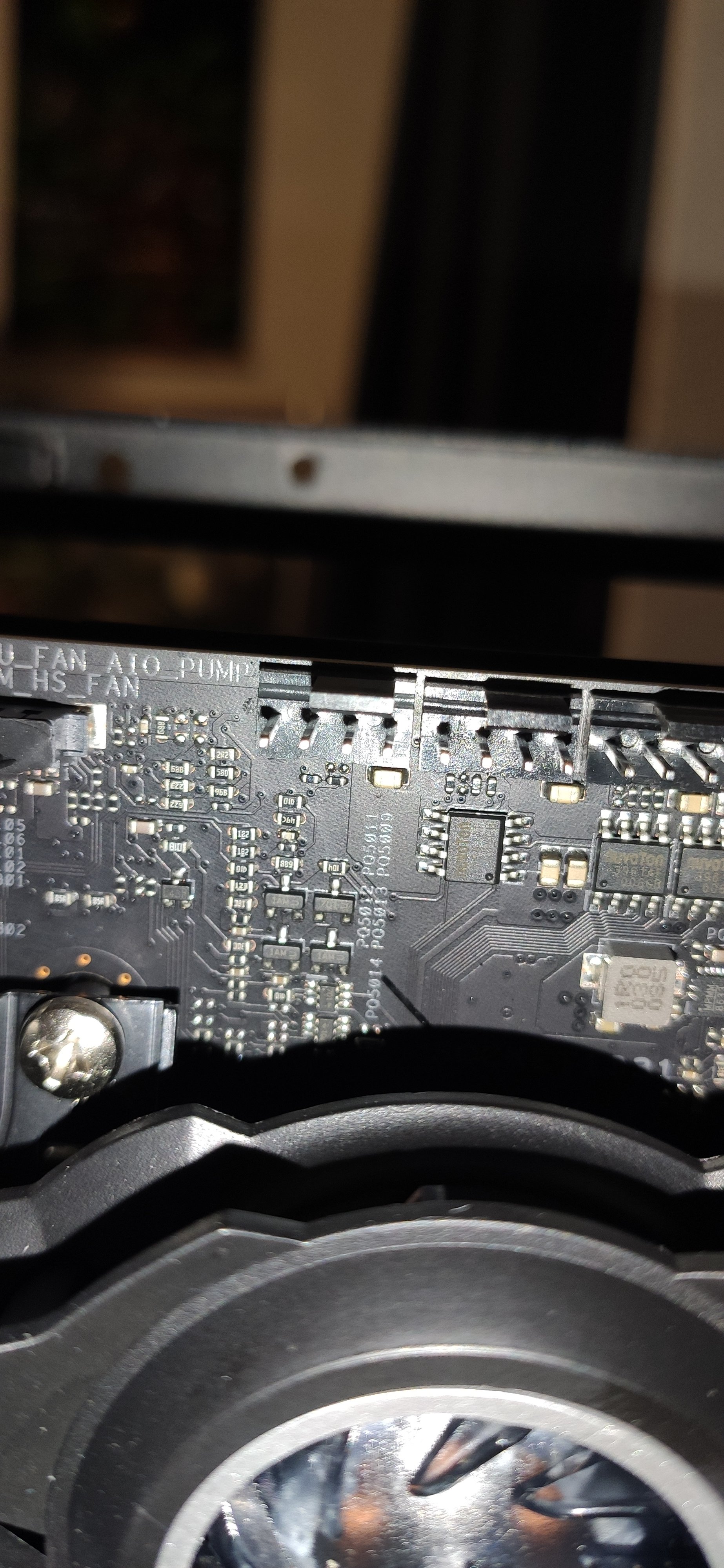 Der Geruch kommt tendenziell entweder oben am Motherboard (so beim CPU Fan Header), im Zwischenraum zwischen Backplate des Motherboards und Spine des Gehäuses, oder vom oberen Lüfter des Radioators.