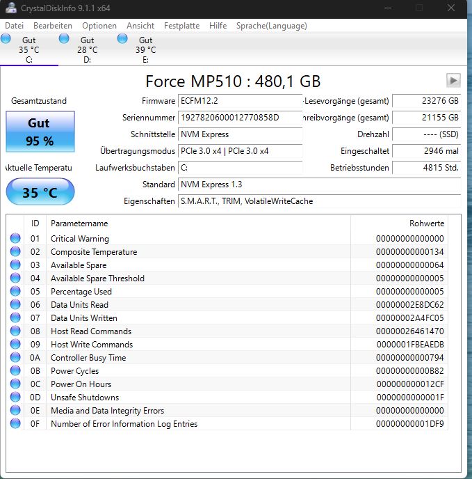 Ich hab mal ganz grobe das Eventlog durchsucht und meine Festplattenwerte 3 SSDs ausgelesen. sieht soweit okay aus.