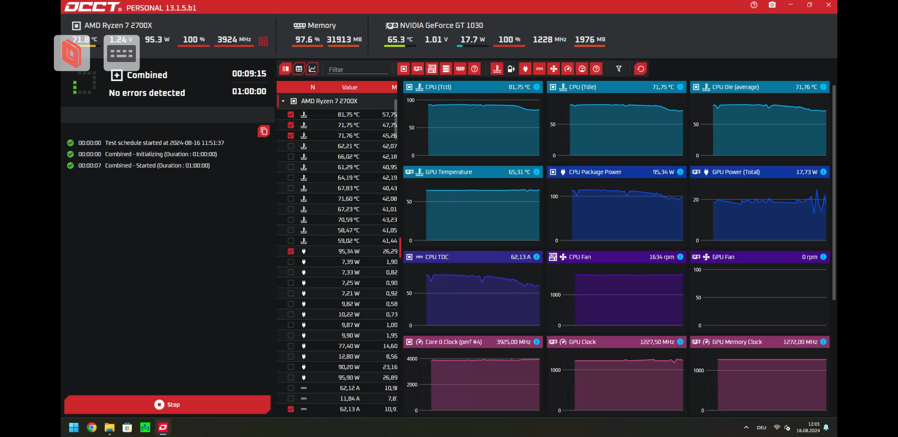 Anschließend habe ich einen Stresstest mit OCCT durchgeführt, inklusive des kombinierten Tests. Alle Tests liefen über eine Stunde ohne Abstürze oder Fehler durch. Ein Kern erreicht dabei zwar kurzzeitig 90 Grad, aber die Temperaturen scheinen insgesamt in Ordnung zu sein.