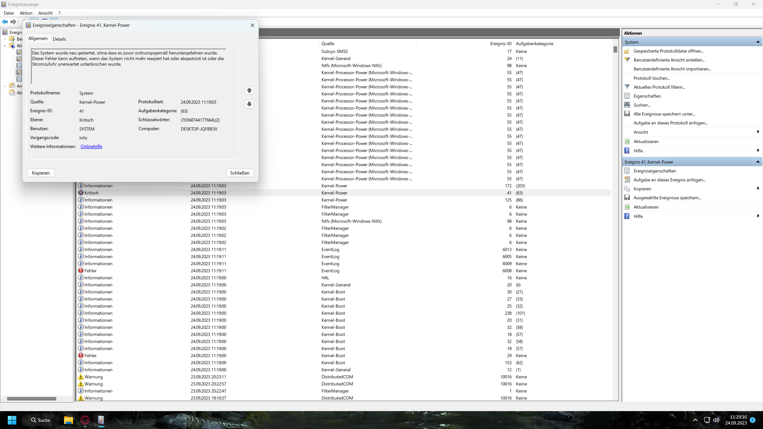 Dann den Kernel Power Fehler: Das System wurde neu gestartet, ohne dass es zuvor ordnungsgemäß heruntergefahren wurde. Dieser Fehler kann auftreten, wenn das System nicht mehr reagiert hat oder abgestürzt ist oder die Stromzufuhr unerwartet unterbrochen wurde.