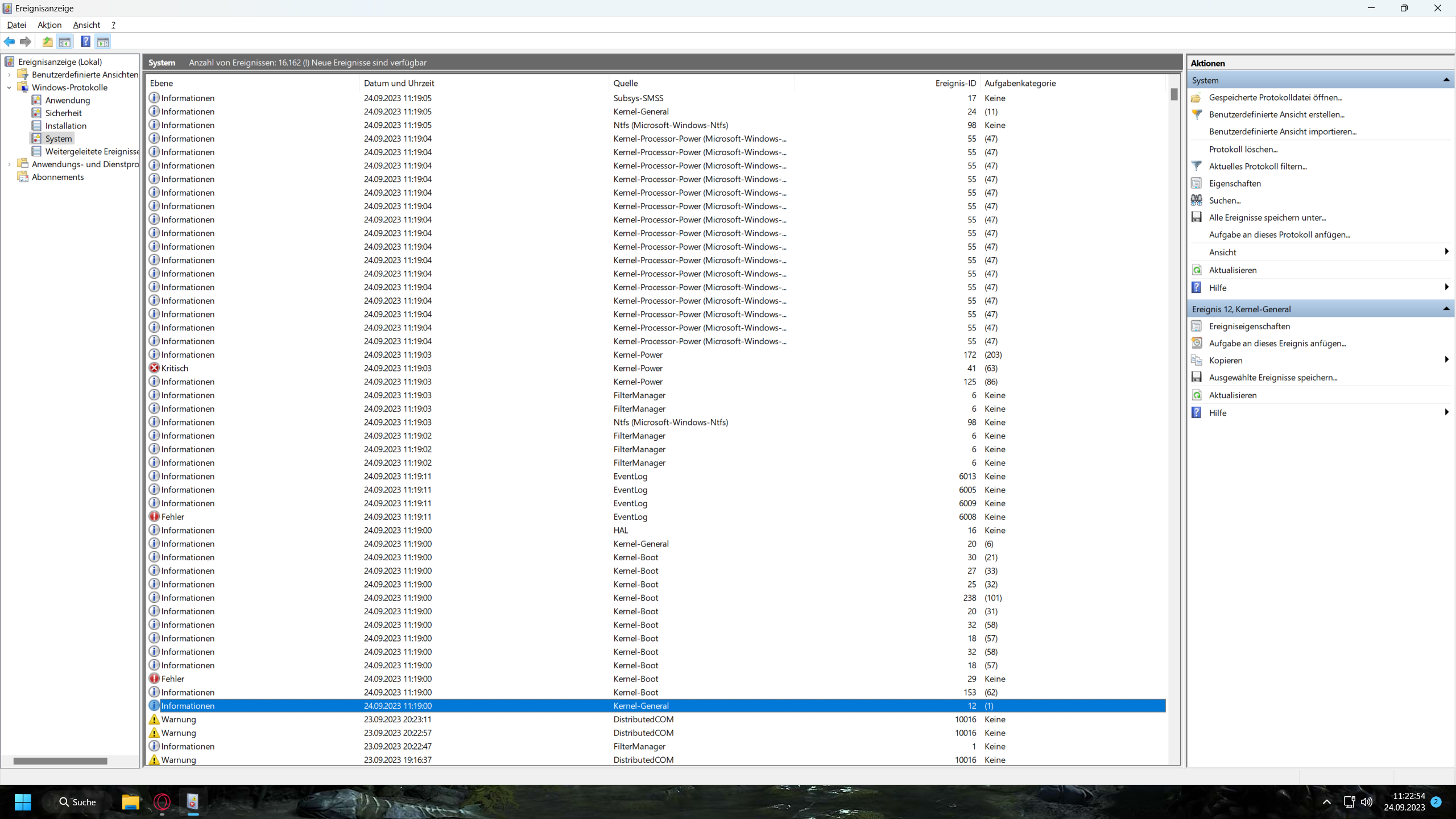 Das System wurde zuvor am 23.09.2023 um 20:21:33 unerwartet heruntergefahren.