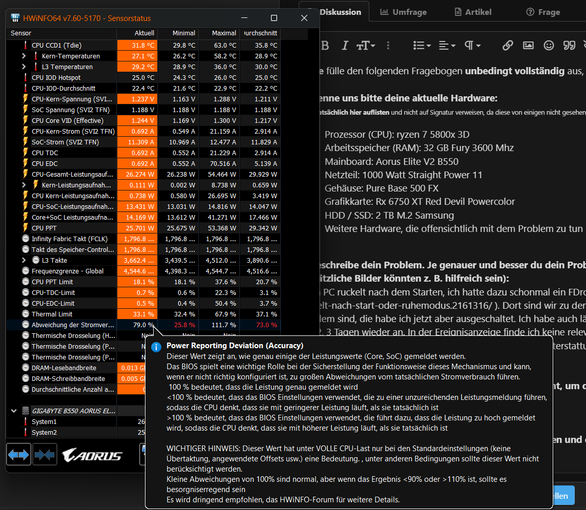 Mein PC ruckelt nach dem Starten, ich hatte dazu schonmal ein Forums Beitrag ( https://www.computerbase.de/forum/threads/pc-ruckelt-nach-start-oder-ruhemodus.2161316/ ). Dort sind wir zu dem Schluss gekommen, dass der Schnellstart und der Ruhemodus das Problem sind, die habe ich jetzt aber ausgeschaltet. Ich habe auch länger keine Probleme mehr gehabt. Allerdings fangen die Probleme seit 2, 3 Tagen wieder an. In der Ereignisanzeige finde ich keine relevanten Fehler. Den einzigen zusammenhang den ich habe ist ein Wert bei HWInfo: "Abweichung des Stromverbrauchs-Berichterstattung" ("Powewr Reporting Deviation") Der Wert wird in Prozent angegeben. Desto niedriger der Wert ist, desto stärker ruckelt und hängt dser PC, wenn der Wert sich wieder erhöt und im "normal Bereich" einpendelt funktioniert der PC einwandfrei. Anbei hänge ich einen Screenshot, aufdem man weitere Erklärung zu dem Wert sieht.