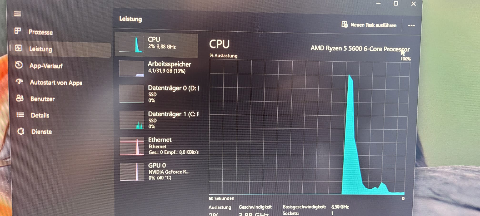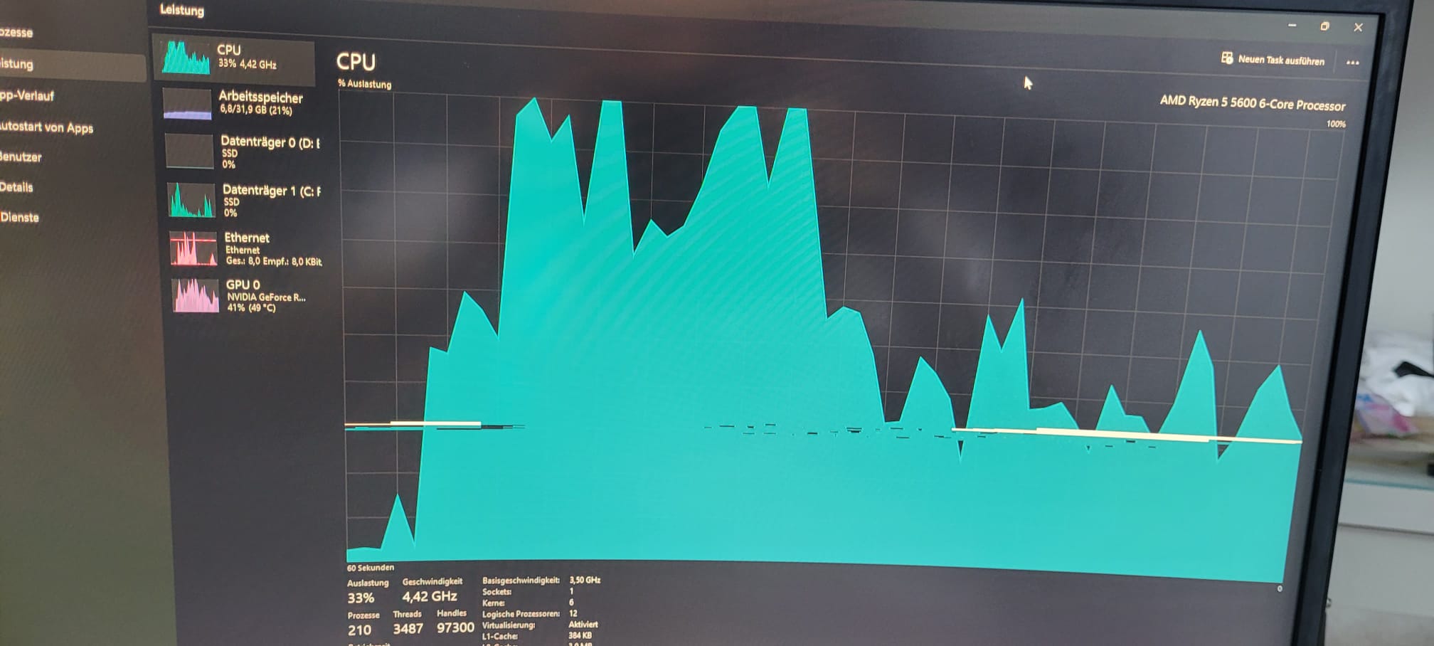 manchmal wenn ich meinen PC starte, beginnt er zu laggen, als hätte ich 2 FPS, und der Bildschirm sieht aus, als hätte er Kratzspuren (das mit den Spuren tritt nicht immer auf aber häufig siehe Bild). Das passiert jedes zweite Mal, wenn ich meinen PC starte. Wenn ich meinen PC neu starte, löst sich das Problem zwar, tritt aber meisten beim nächsten hochfahren wieder auf. Ich habe meinen PC bereits auf werk Einstellungen zurückgesetzt und meinen Arbeitsspeicher von 16 GB auf 32 GB erhöht, weil mein Freund sagte, das könnte helfen. Leider konnte ich das Problem nicht lösen. Im Task manage konnte ich herausfinden das jedes mal wenn das Problem auftritt die CPU Auslastung am Start bei 100% ist und dann langsam sinkt, wenn ich in diesem zustand aber ein Programm öffne schießt sie direkt wieder auf 100% hoch und es lagt stark. Meistens beansprucht es den PC dann so sehr das er abstürzt.