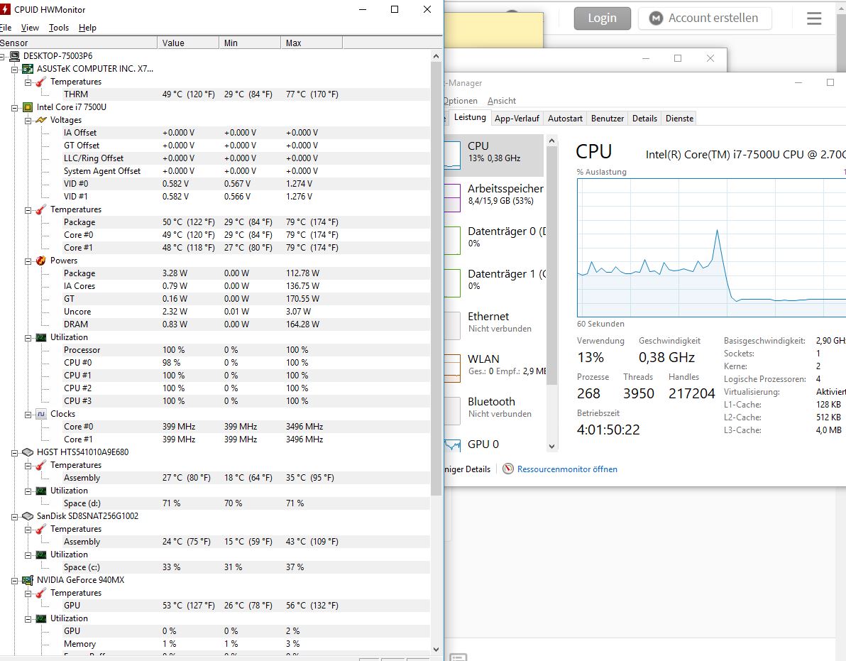 ich habe seit ca 9 Monaten einen Asus-Laptop F756U. Seit kurzem ist es so, dass das Gerät immer mal ein bisschen hängt und der Prozessor stark ausgelastet ist, auch wenn keine rechenintensive Anwendung betrieben wird. Auch ist der Lüfter, der sonst immmer sehr leise war des öfteren sehr laut. Ich hatte erst die Vermutung dass der CPU zu heiß wird, deswegen habe ich das Progamm HWMonitor installiert, allerdings scheint von der Temperatur her alles in Ordnung zu sein. Jedoch habe ich in diesem Programm gesehen, dass manchmal die CPU-Auslastung bei 100 % steht (siehe Bild). Man kann über den Task-Manager ja auch die Auslastung sehen und dort wird seltsamerweise ein wesentlich geringerer Wert angegeben. Die GPU-Auslastung der internen Intel HD Graphics-Grafikkarte steht auch auf 100 %