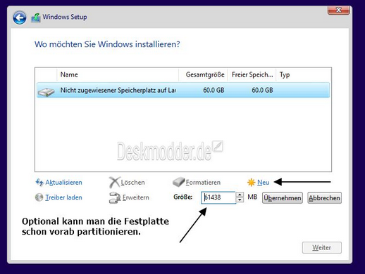 1) löschst du alle Partitionen, sodass du nur einen nicht zugewiesen Platz hast. Bild 1