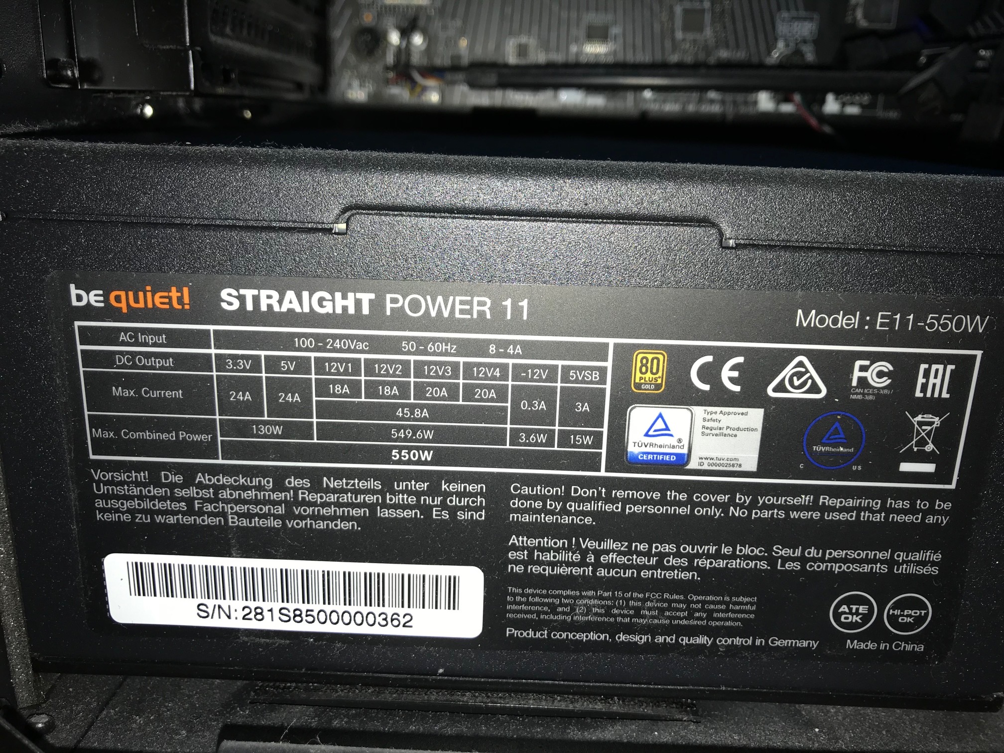 Ok, das Netzteil ist ein BeQuit, welches wohl 100-240V im Eingang mag. Das passt. Leider fehlt die genaue Bezeichnung und JEDES Netzteil sollte diese Eingangsvarianz können. Die genaue Bezeichnung ist aber Pflicht, um die Leistung des Netzteil in Deinem Anwendungsfall zu beurteilen, so hilft die Angabe nicht wirklich.