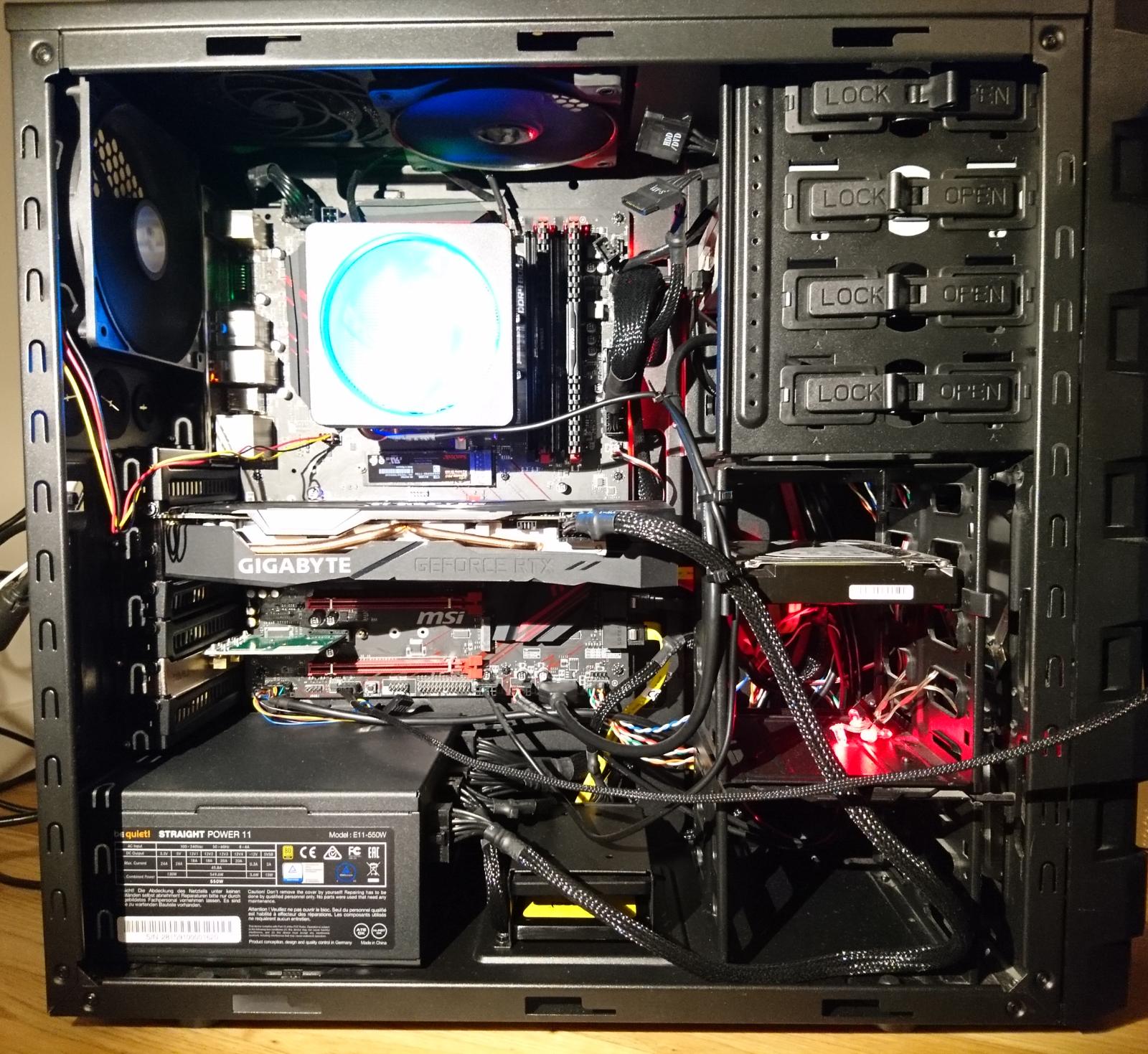 Sieht zwar immer noch nicht ordentlich aus, aber wenn das Case eh geschlossen ist juckt das auch nicht. Der Luftfluss wird eh mehr von den Käfigen als von den Kabeln gestört.