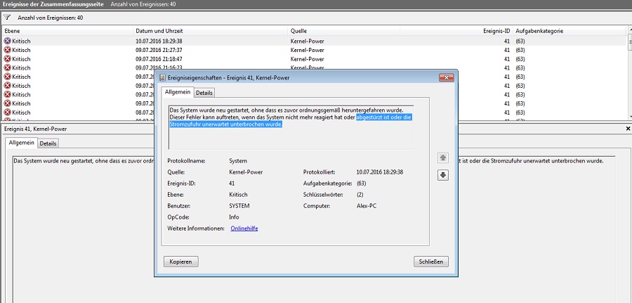 Dann wäre da auf der anderen Seite noch die Vermutung mit kaputtem Netzkabel. Denn unter den Windows Ereignissen findet sich für jedes Mal, wo es passiert, der Fehler Kernel Power 41. Das sieht dann wie folgt aus: