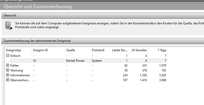 In der Windows Ereignisanzeige sehe ich nicht viel, außer dass das System unerwartet heruntergefahren (ausgeschalten ohne Vorwarnung) wurde. Seit gestern 4x, das stimmt, gestern 3x und heute 1x, auf die ganze Woche 7x. Das wundert mich, denn bis gestern zum ersten ausschalten lief alles (gefühlt) normal.