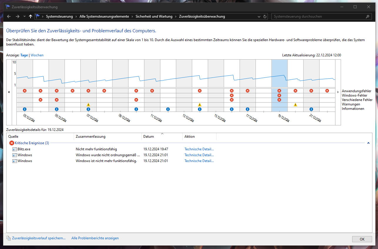 Der Zuverlässigkeitsverlauf zeigt fast für jeden Tag ne Warnung an. fast immer ist es die Blitz.gg AppGelöschter_User schrieb:Du kannst dein System damit schrotten. Ich meine, schlägt das Update fehl, weil ein Fehler oder was auch immer aufgetreten ist, dann startet dein PC nicht mehr. Für ein BIOS Update musst du genau wissen was du machst. Ich will jetzt keine Angst machen. Es gibt diverse Anleitungen. Werden die beachtet, dann sinkt das Risiko eines Ausfalls enorm. Es kann immer was schiefgehen. Gigabyte stellt dieses Hillfsmittel zur Verfügung.