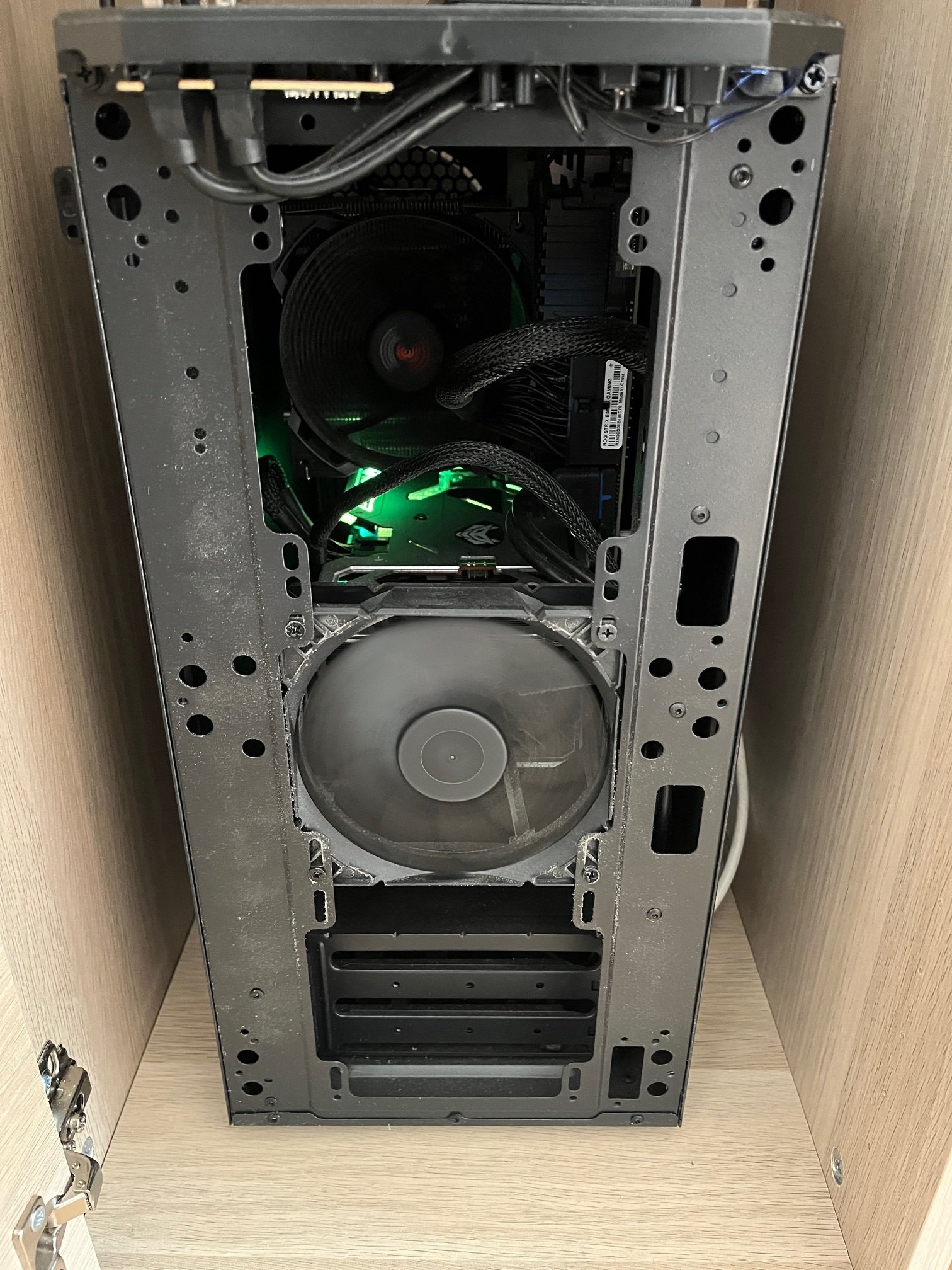 ich habe meinen PC in einen Schrank gestellt und links und rechts zwei Lüftungsgitter angebaut (Bild). Die Wärmeentwicklung bei Spielen ist aber trotzdem sehr hoch. Ich möchte deswegen hinter die Lüftungsgitter je 3 Lüfter auf beiden seiten einbauen - einmal forward und einmal reverse damit ich im Winter auch warme Füße unter dem Tisch habe