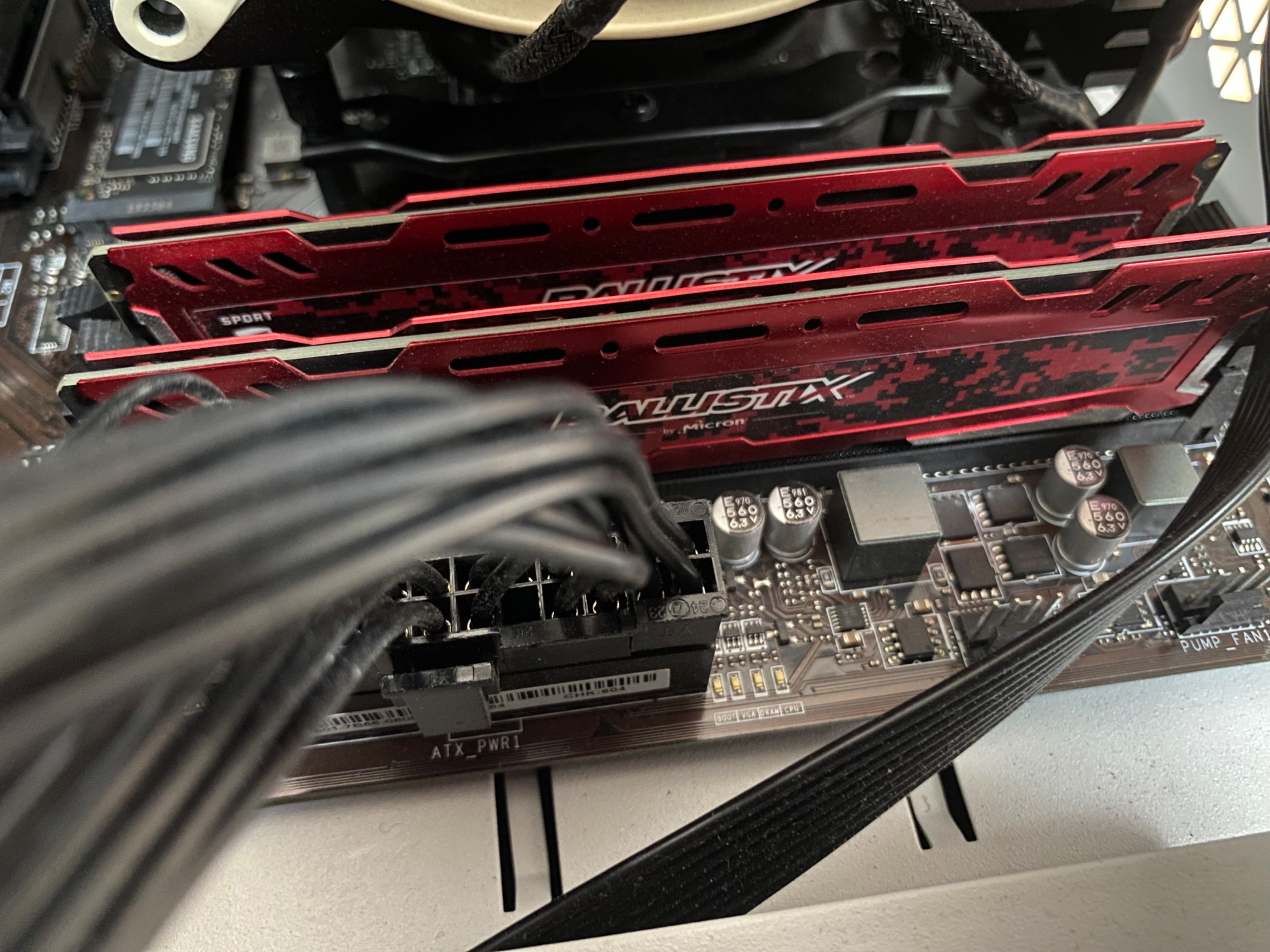 @JumpingCat Das ist ein guter Fund. Der 2te kleine 24pin stecker ist nicht angesteckt. Wieso? Der sollte angesteckt sein. Kann sein das er da irgendwie zu wenig Power/etc. bekommt.