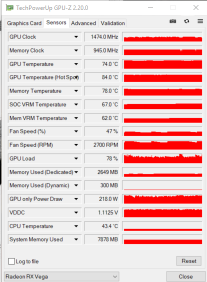 Die von dir genannten Taktfrequenzen [um 1.250-1.400 MHz] sind die normalen Taktfrequenzen die eine RX Vega 64 im Referenzdesign schafft.