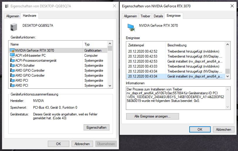 Nun habe ich das Problem, dass sobald ich den neusten Treiber für meine Rtx3070 installiert habe, Windows anfängt die Grafiktreiber neuzuinstallieren und alle 2 sekunden das Bild schwarz wird. Die drei Ereignisse sind dabei nachzuvollziehen: "Der Prozess zum Hinzufügen von Dienst nvlddmkm für Geräteinstanz-ID PCI\VEN_10DE&DEV_2484&SUBSYS_146B10DE&REV_A1\4&2283F625&0&0019 wurde mit folgendem Status beendet: 0." danach kommt "Der Prozess zum Hinzufügen von Dienst NVDisplay.ContainerLocalSystem für Geräteinstanz-ID PCI\VEN_10DE&DEV_2484&SUBSYS_146B10DE&REV_A1\4&2283F625&0&0019 wurde mit folgendem Status beendet: 0." und dann "Der Prozess zum Installieren von Treiber nv_dispi.inf_amd64_a51067c0ac557884 für Geräteinstanz-ID PCI\VEN_10DE&DEV_2484&SUBSYS_146B10DE&REV_A1\4&2283F625&0&0019 wurde mit folgendem Status beendet: 0x0."