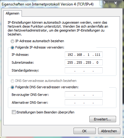 - unter Netzwerkeinstellungen gibst du nur IPv4 und Subnetz an z.b. 192.168.2.20 255.255.255.0, Gateway und DNS lässt du leer