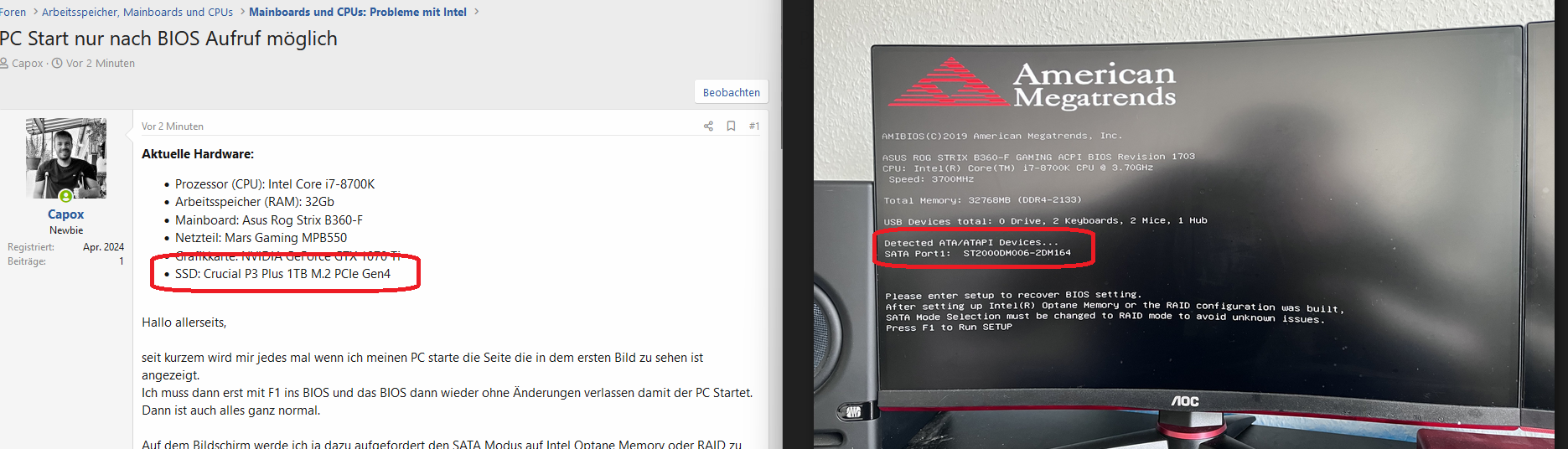 Ich muss dann erst mit F1 ins BIOS und das BIOS dann wieder ohne Änderungen verlassen damit der PC Startet.