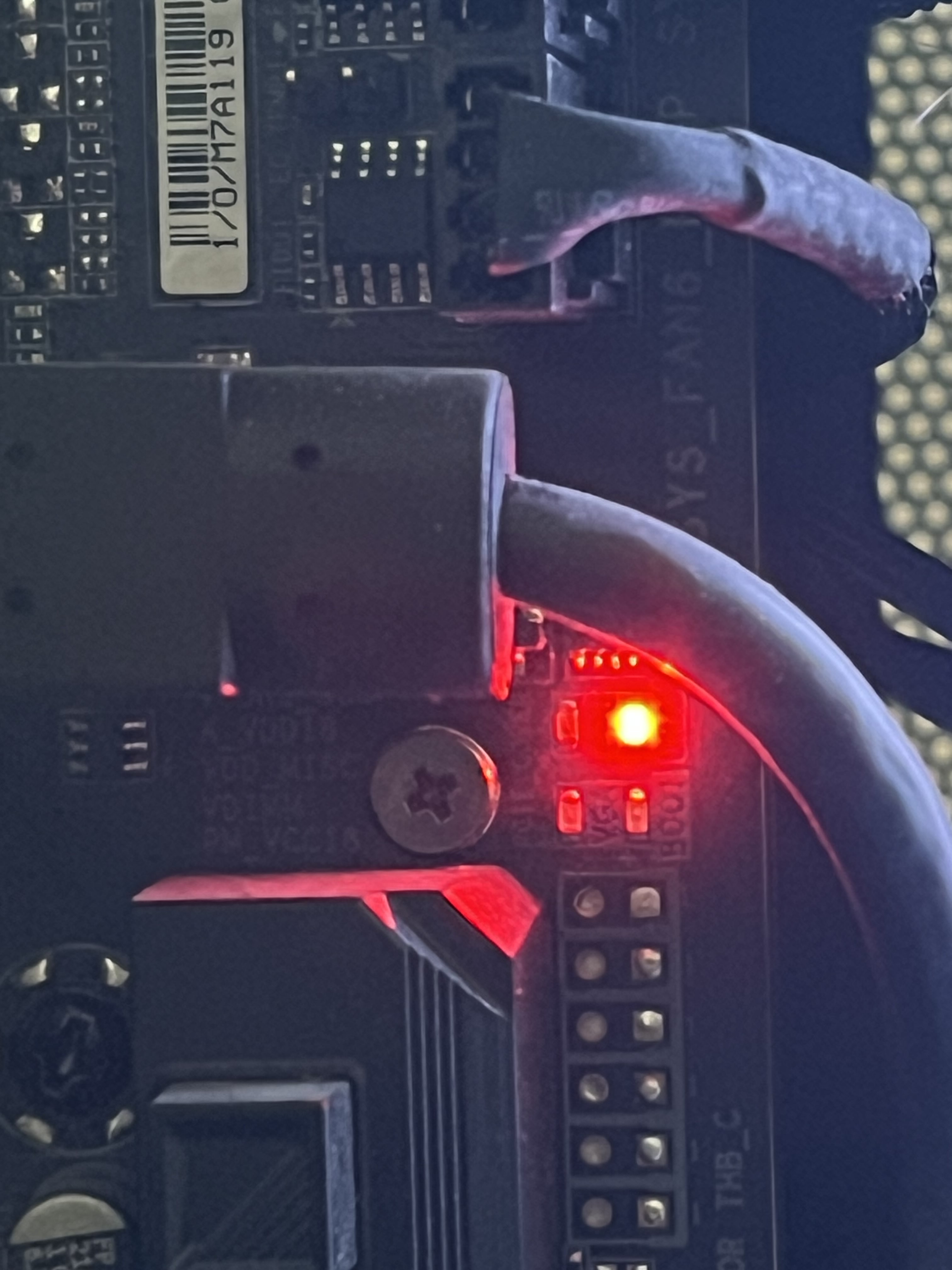 Dann habe ich diese rote Leuchte im Mainboard gesehen und habe mal einen RAM-Riegel rausgenommen.