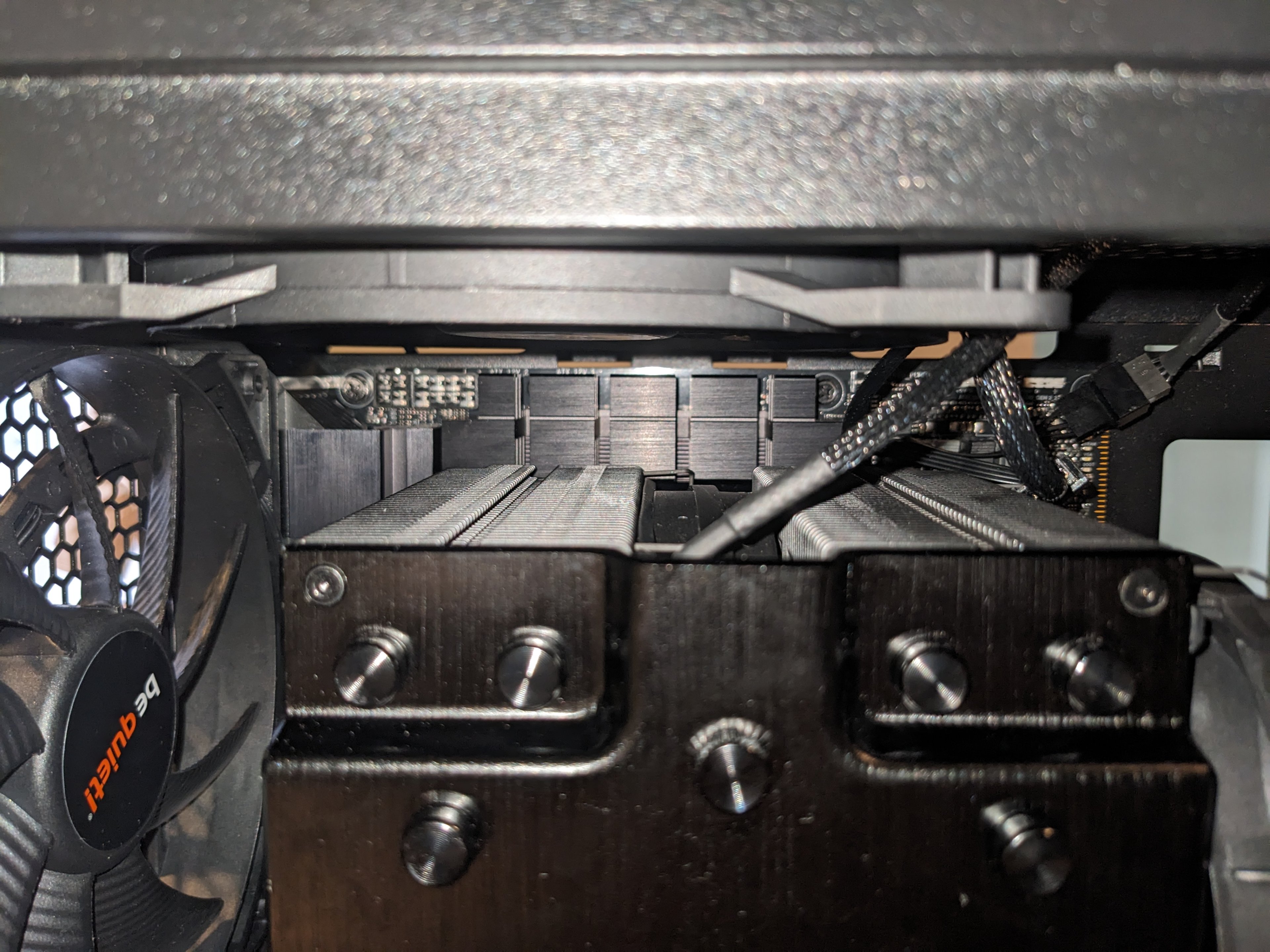 Beim anschalten drehen kurz alle Lüfter, schalten sich aber innerhalb einer Sekunde aus mit einem "klick" (kein beep) - bis auf einen Gehäuselüfter, der läuft weiter.