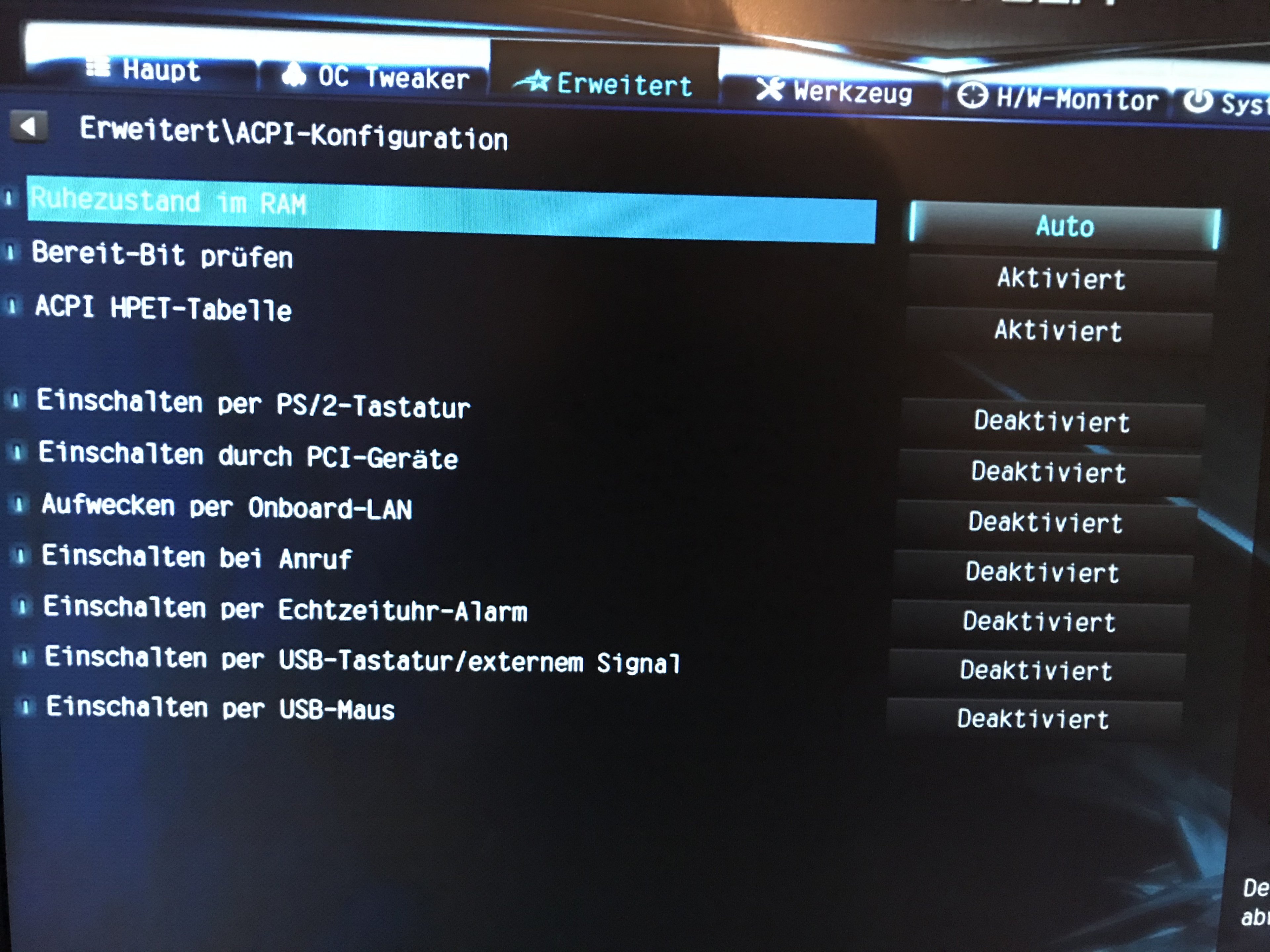 Alle "Wake on" Funktionen im BIOS sind deaktiviert (siehe Bild) und das BIOS ist auch auf dem neuesten Stand. Zusätzlich wurden bereits alle Kabel, bis auf den Netzstecker vom Netzteil, vom PC entfernt und er fährt immernoch hoch. Eine Aktivierung durch externe Geräte ist damit ausgeschlossen. In der Aufgabenplanung von Windows habe ich ebenfalls nichts gefunden.