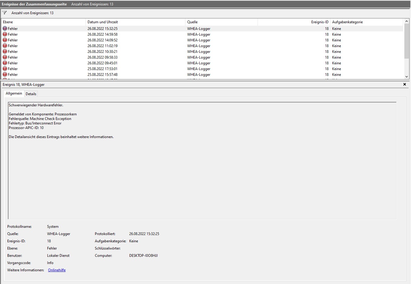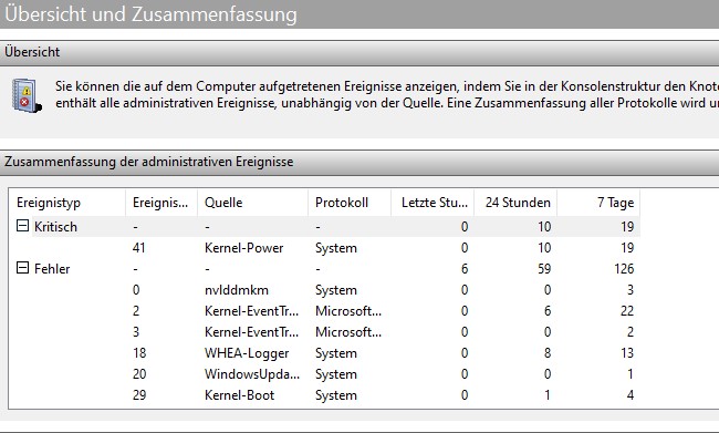Hallo, mein Name ist Julian, ich habe mir vor etwa zwei Wochen einen PC zusammengebaut, Nun habe ich leider folgendes Problem und weiß nicht mehr weiter, Ich bitte um eure Hilfe. PC startet sich neu sobald man 1-10minuten im Spiel ist (BF5, Hunt, New World,) Ereignisanzeige: 41 Kernel Power, Kernel-EventTracing, WHEA-Logger.