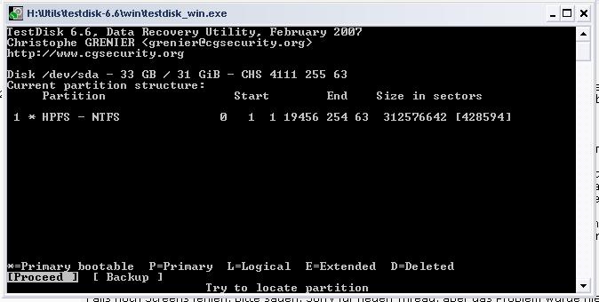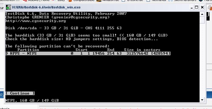 5. Hier dann im Forum gelesen und Testdisk laufen lassen (siehe Anhänge) Hier habe ich das "Festplatte zu klein" Problem (Platte richtig im BIOS erkannt) Werden nur 31 GB erkannt. Hier hat mich jetzt stutzig gemacht, dass mein Chef meinte, seine Platte sei nur 40GB groß. Ich vermute also, dass nur 40GB Partitioniert sind.