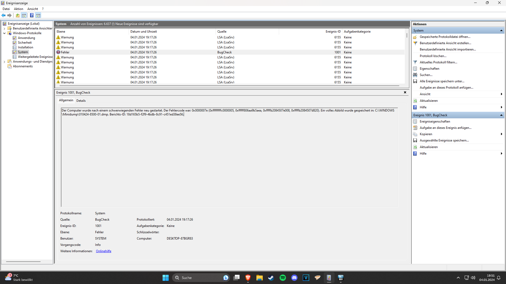 Der Computer wurde nach einem schwerwiegenden Fehler neu gestartet. Der Fehlercode war: 0x0000007e (0xffffffffc0000005, 0xfffff806aa9b5aea, 0xffffb2084507e008, 0xffffb2084507d820). Ein volles Abbild wurde gespeichert in: C:\WINDOWS\Minidump\010424-8500-01.dmp. Berichts-ID: 18d165b5-f2f9-4bdb-8c91-c451ed38ee56.