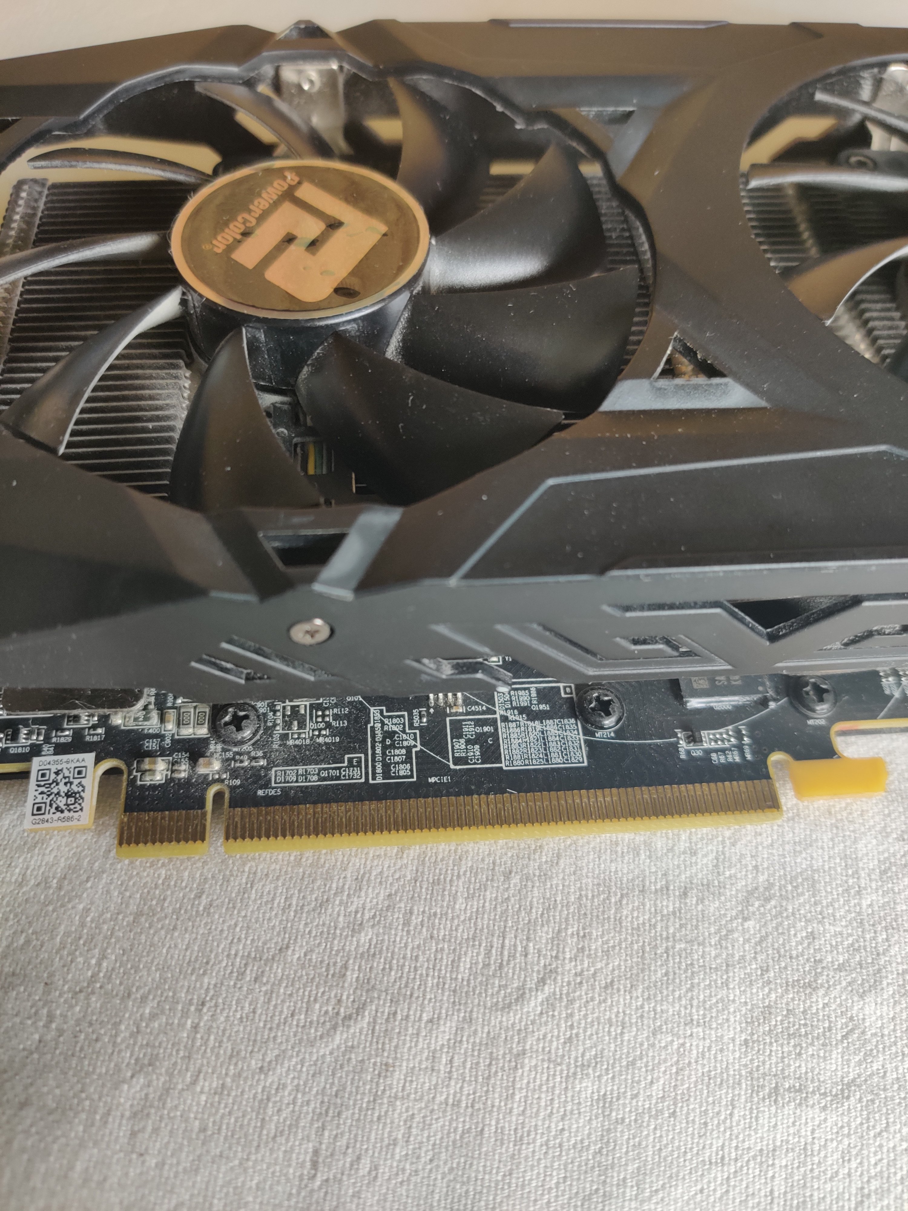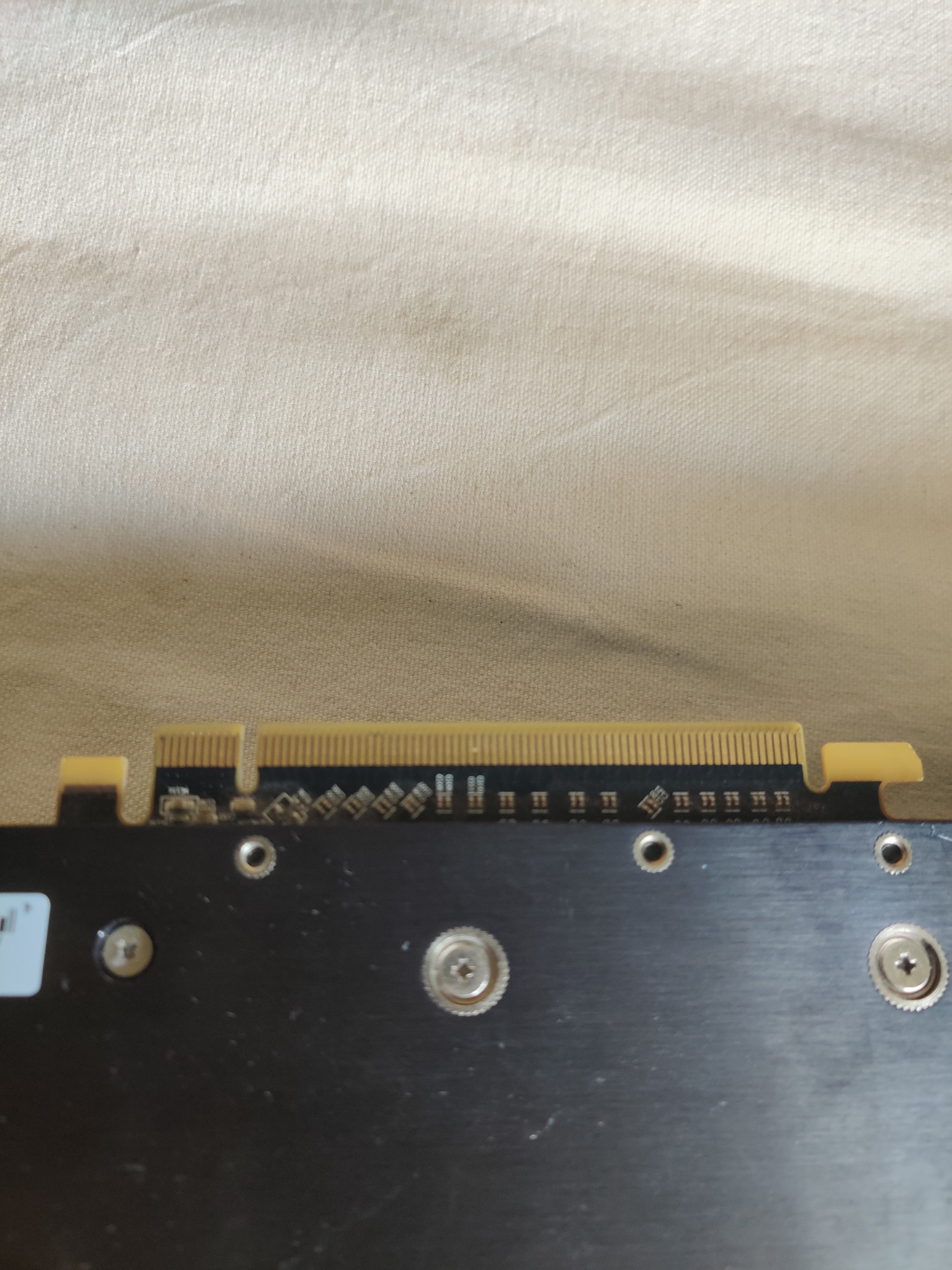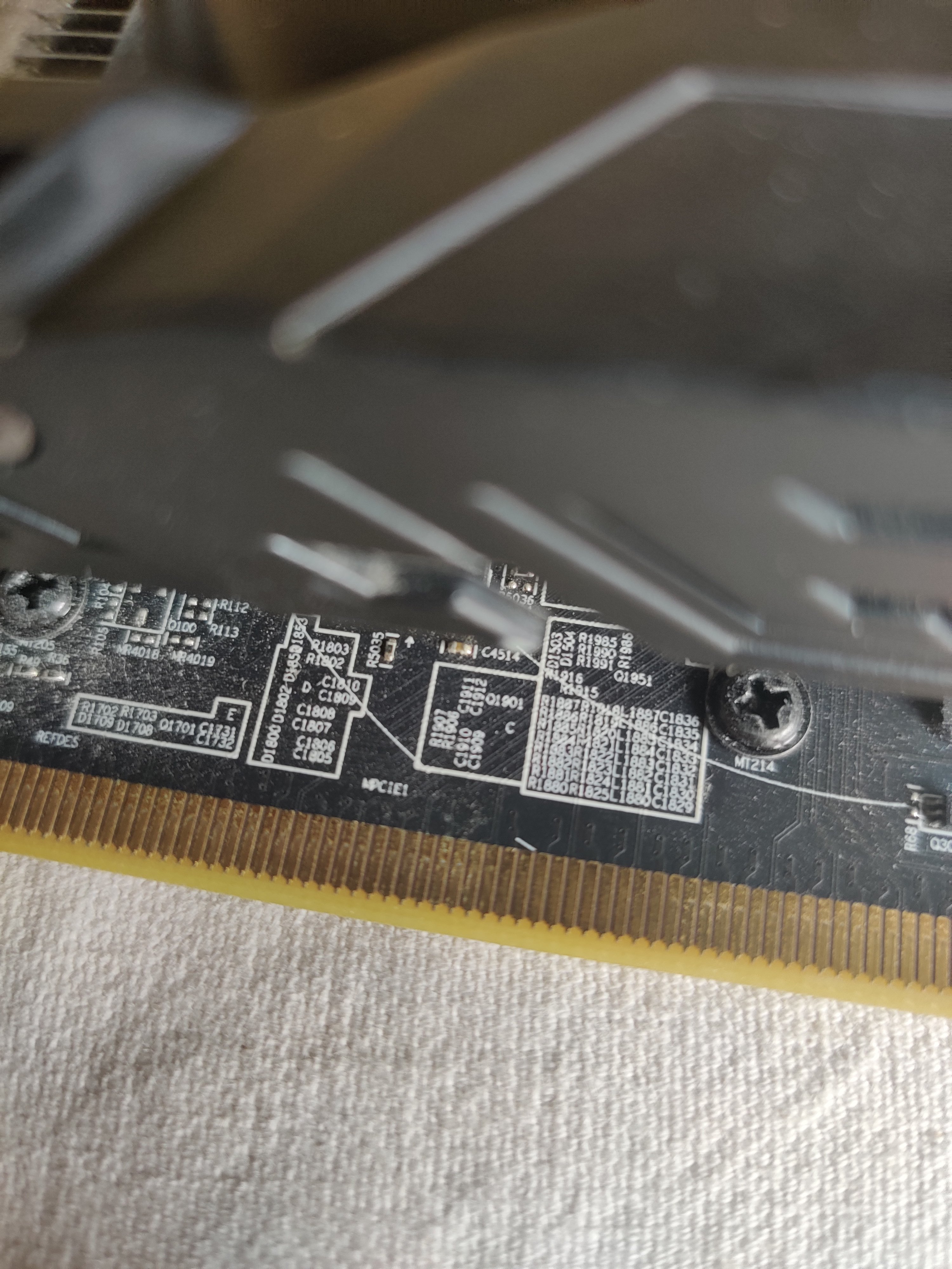 Bitte einmal von der Grafikkarte eine Detailaufnahme des PCIe Interfaces von beiden Seiten machen, nicht das dort etwas beschädigt würde oder aber das PCB der Karte angebrochen/abgeschrammt ist
