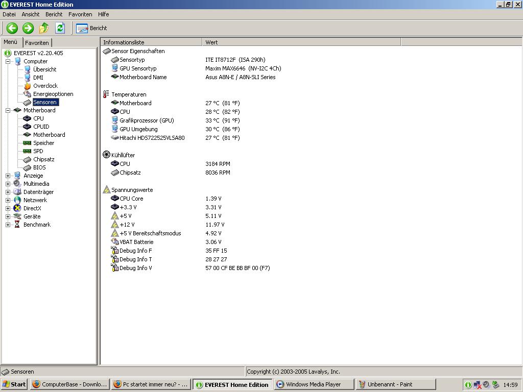Ein Bekannter von mir hat sich vor kurzem einen PC zusammengebaut. Der PC ging an. Alles ging gut bis wir mal ein Spiel installiert haben (GTA San Andreas). Natürlich wollten wir es ausprobieren. Wir starteten das spiel und auf einmal geht der PC aus und startet neue hmmm :mad: dachteten wir uns und versuchten es noch mal und wieder das selbe. Sofort haben wir andere Spiele installiert und geschaut ob es bei den auch so ist (CS Source, Doom3,SOF 2 unsw.) Siehe da das selbe Problem. Ich dacht vileicht liegt es irgend wo an der Hardware und hab prime drüber laufen lasen aber es kamen keine fehler. Also müsste es nicht an den rams,cpu, Netzteil liegen. So es bleibt noch Mainboard und Grafikkarte übrig. Ich bin auf die Home von Asus gegangen und habe mir dort die neuste bios Version runtergeladen 1013 und auch alles installiert was da dabei stand. Es blieb noch die Grafikkarte übrig wir habe am Anfang den Treiber von der CD installiert die bei der Grafikkarte dabei wahr aber auch andere und es tritt trotzdem das selbe Problem auf. Die Temperaturen sind alle in grünen Bereich. Kann es an der Festplatte liegen? Ich hab schon hier die Suchfunktion benutzt aber noch nichts gefunden was mir weiter helfen kann. Weis jemand von euch an was es liegen kann?