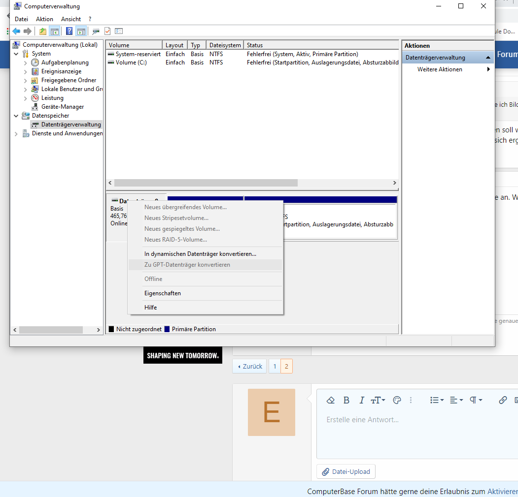 Klicke mal dein Laufwerk C: vorne mit rechter Maustaste an. Wenn da zu MBR konvertieren steht, ist er in GPT installiert