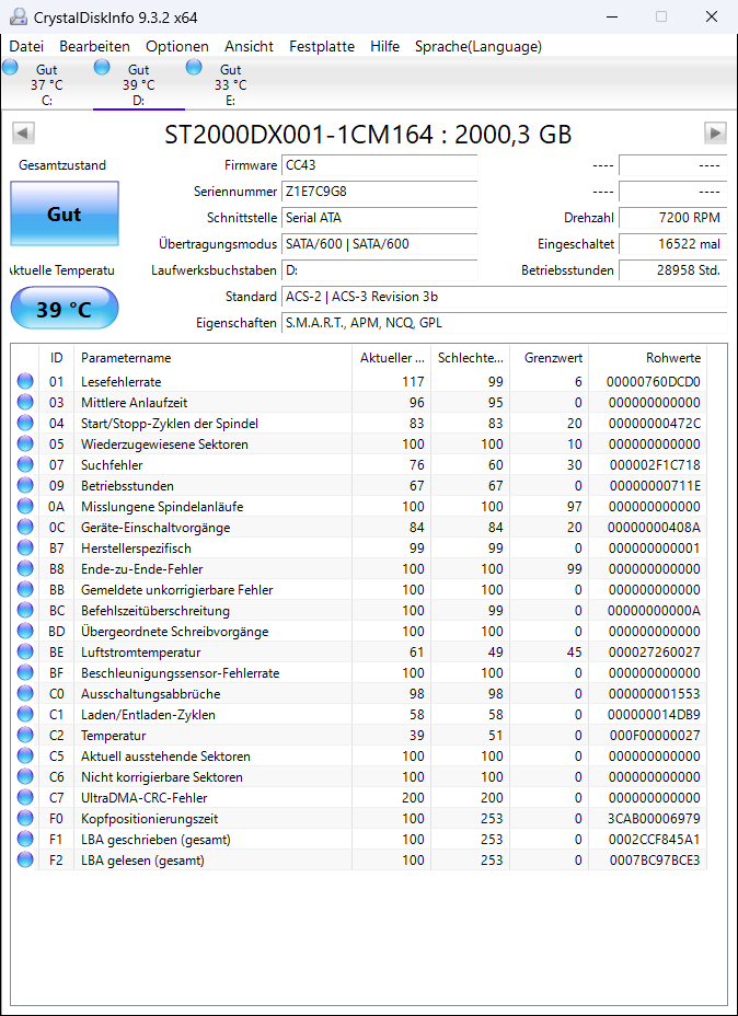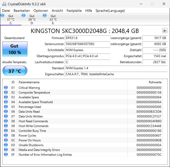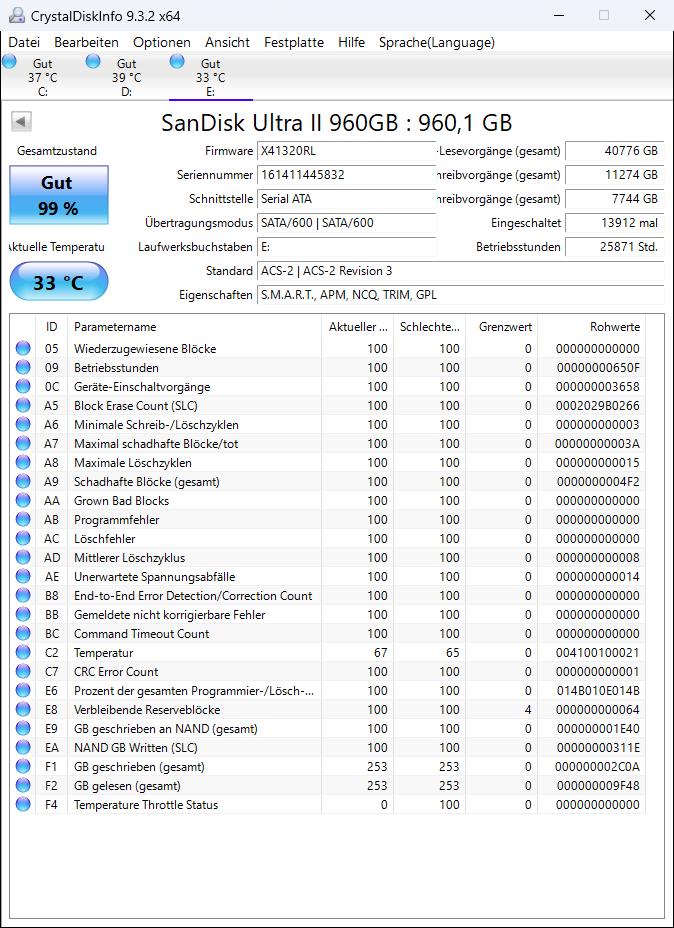 - HDD / SSD: 2TB, 2TB Kingston KC3000 M.2 PCIe 4.0 x4 3D-NAND TLC (System und Programme), Seagate Desktop SSHD SATA, 6 GB/s, 2 TB (Daten), SSD Sandisk Ultra II 960GB (Backup), Software aktuell