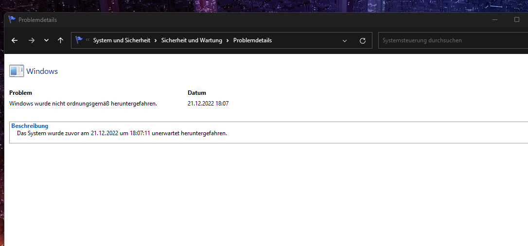 Im Zuverlässigkeitsverlauf steht nur windows wurde unerwartet heruntergefahren.
