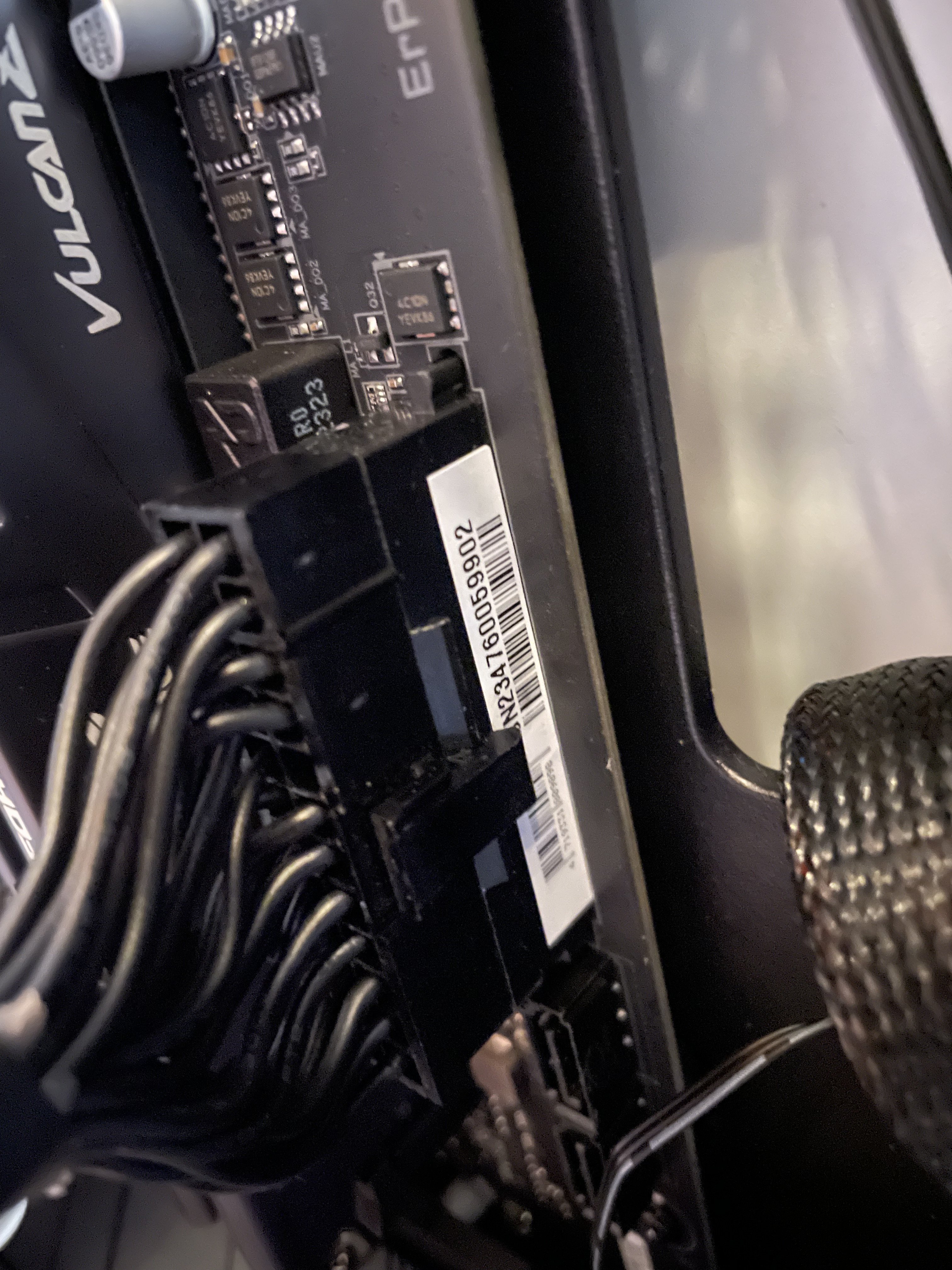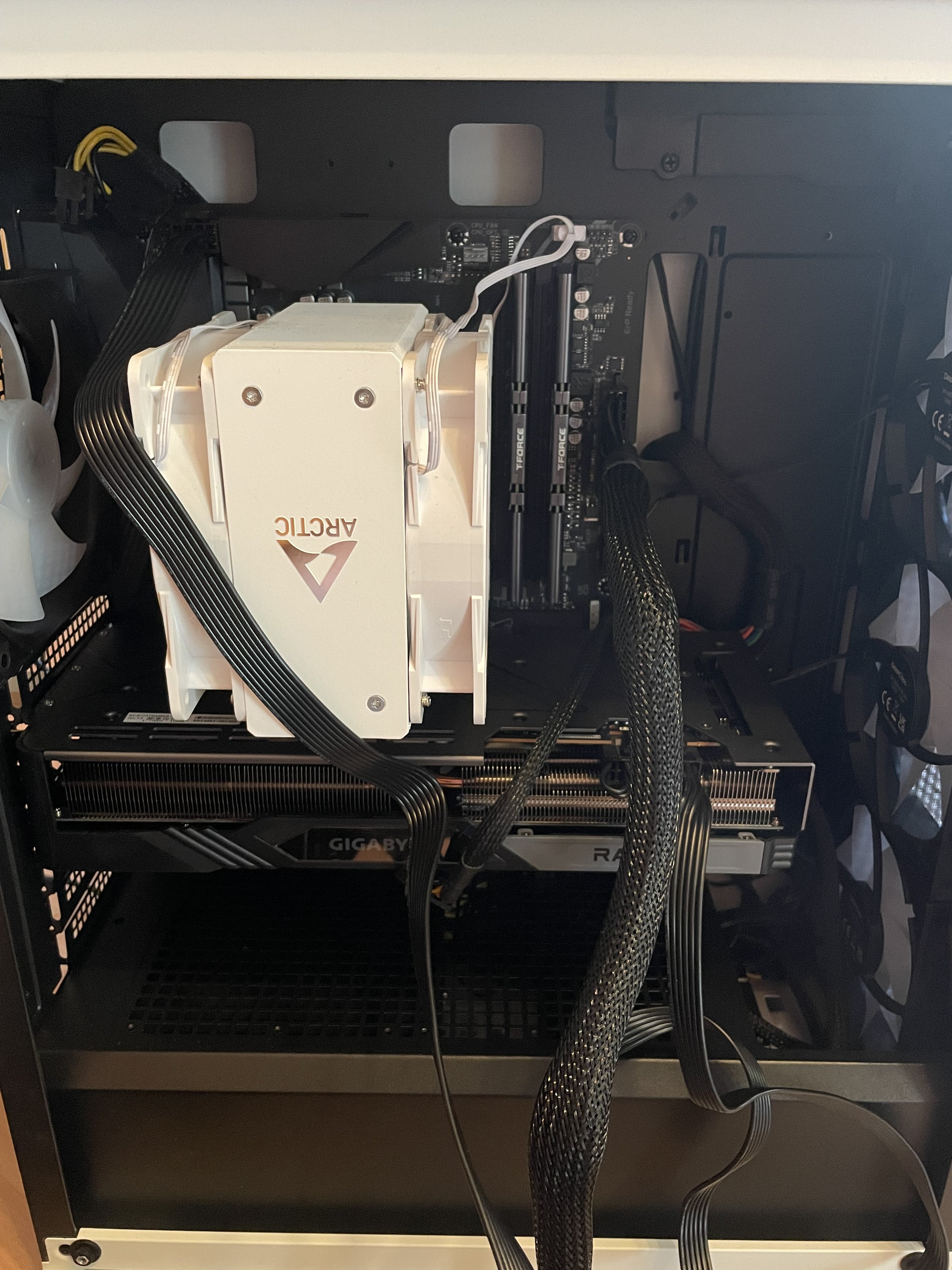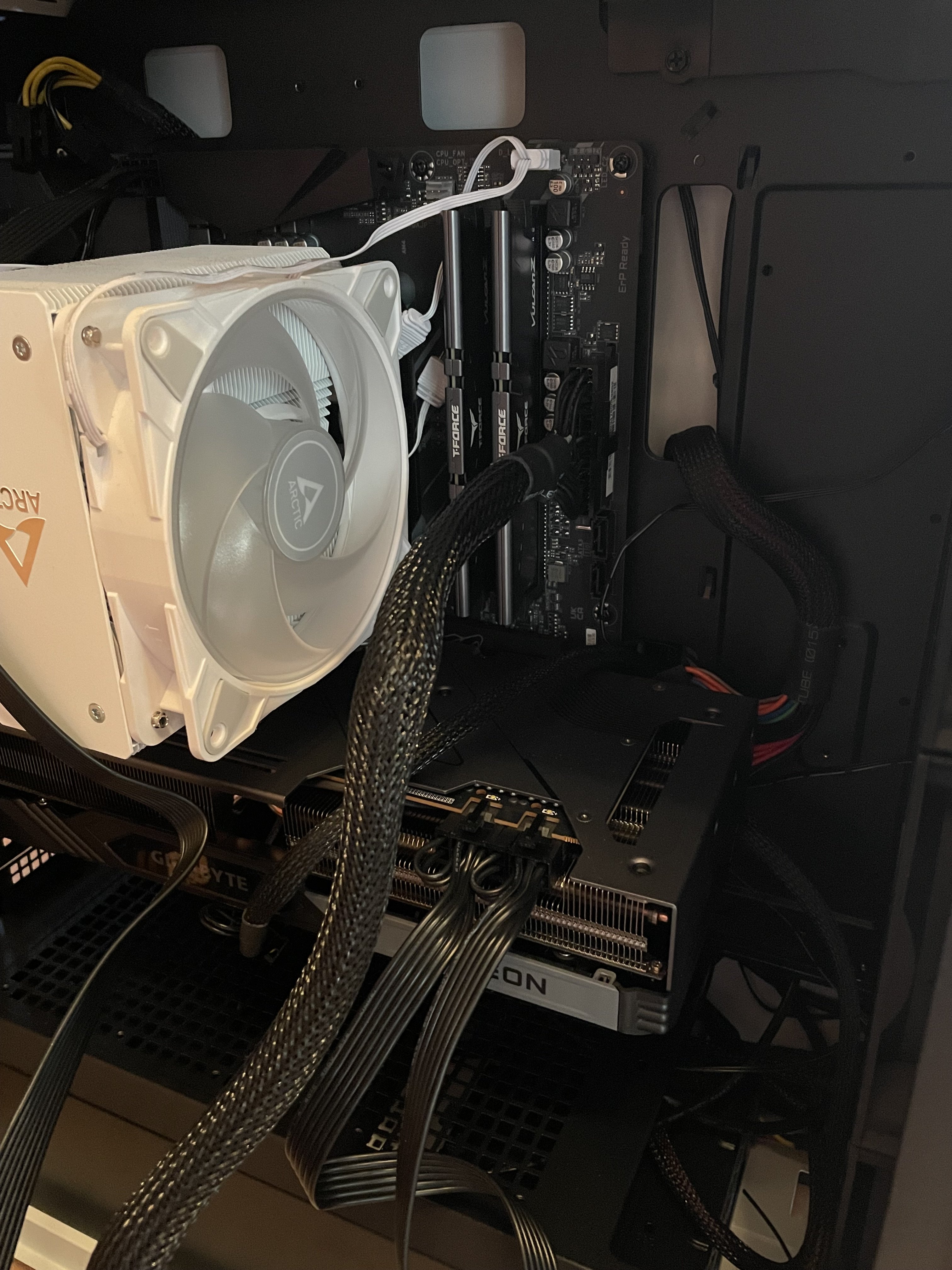 Nun versuche ich das System zu starten, bekomme aber kein Bild. Alle Gehäuse und Kühler Lüfter laufen und bei der Grafikkarte (RGB Beschriftung leuchtet auch und die Power LED an der GPU leuchtet nicht, also bekommt sie Strom oder?) aber die GPU Lüfter drehen sich nicht.