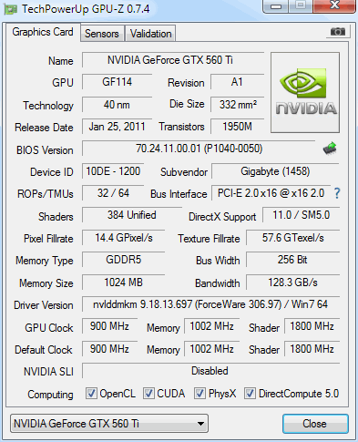 1024MB Gigabyte GTX560 Ti OC GDDR5 PCIe
