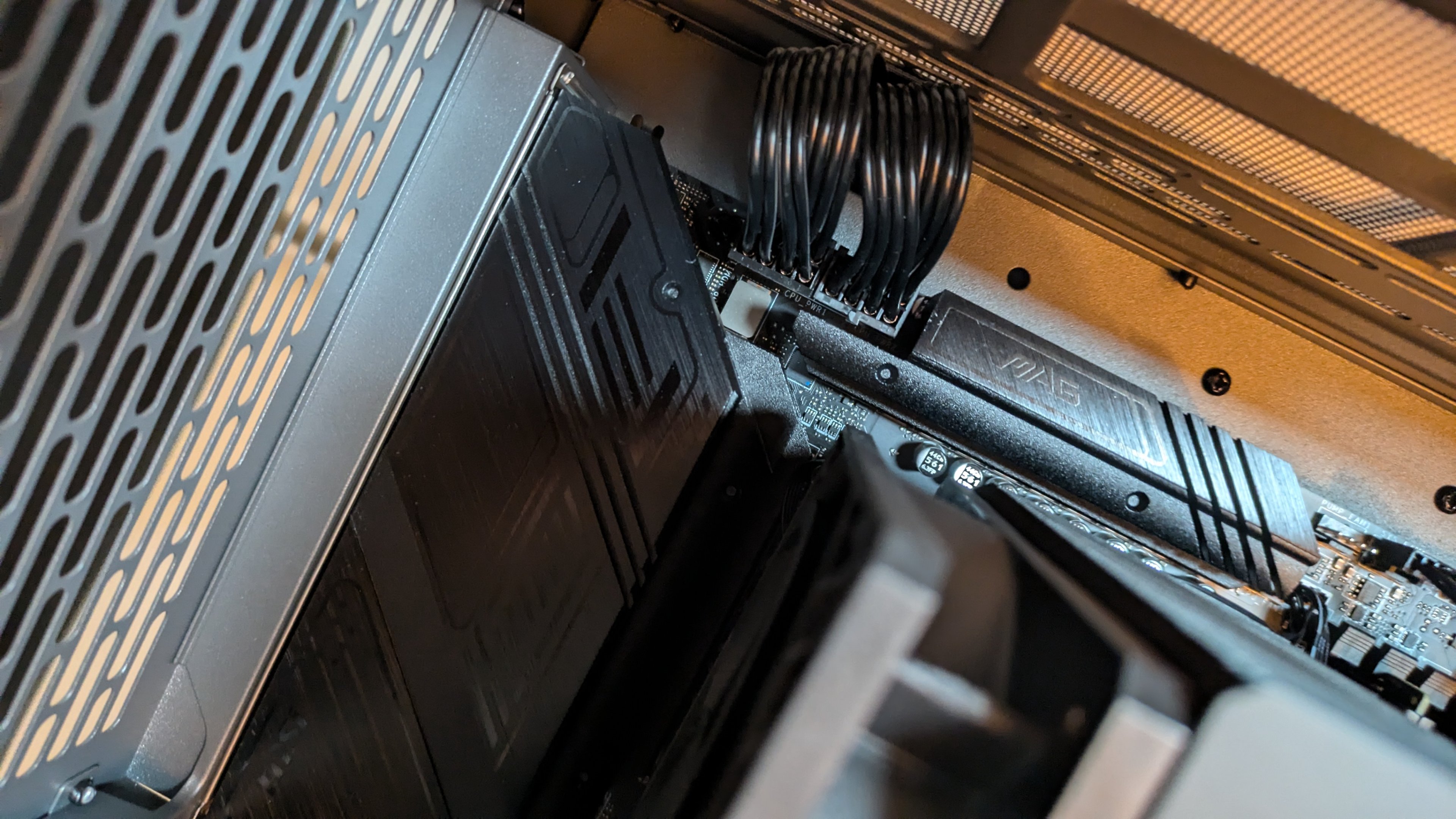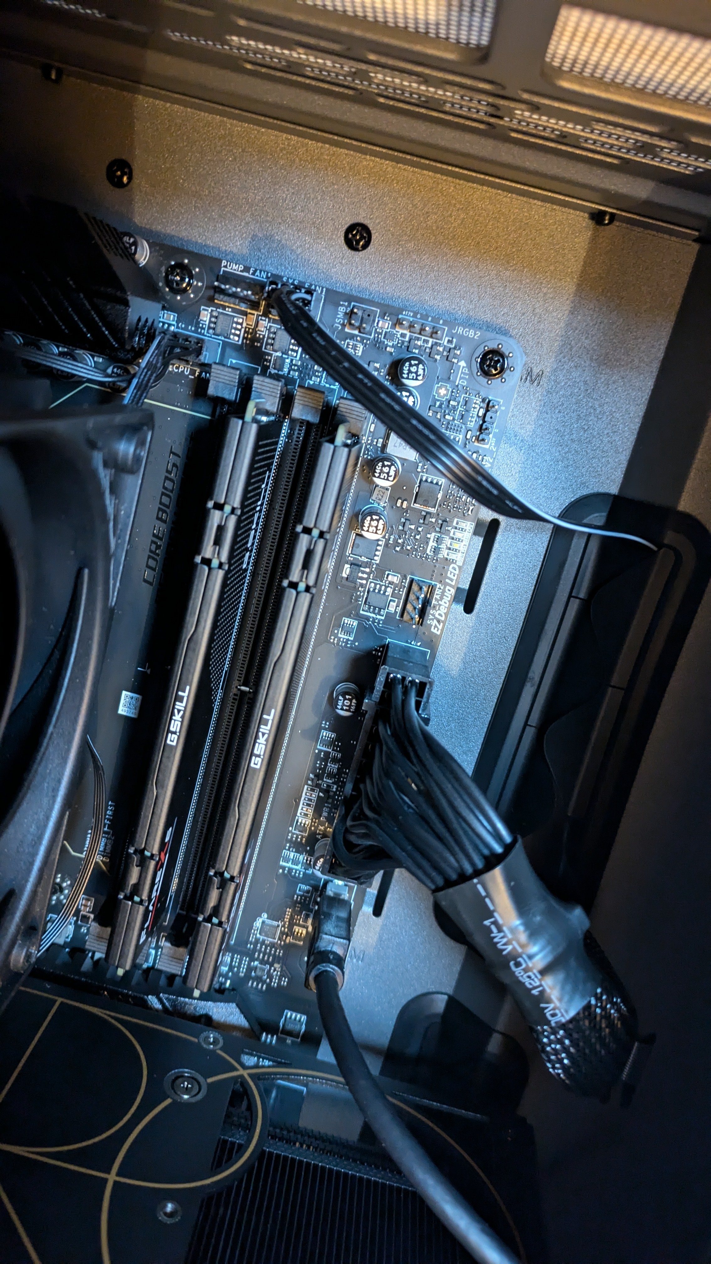 Kein Lüfter dreht sich. Auf dem Mainboard leuchten die beiden oberen DEBUG LEDs kurz Rot/Orange auf.